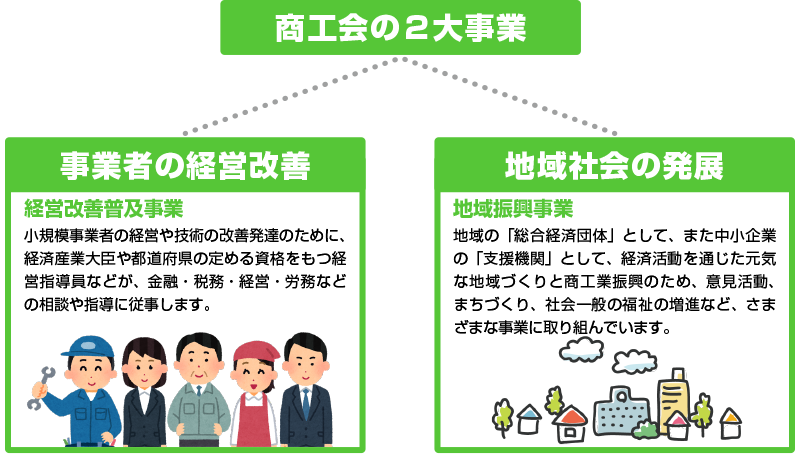 商工会は、地域事業者が会員となり、ビジネスや街づくりのために活動を行う総合経済団体です。「商工会法」に基づいて設立され、全国の市町村に1,667(平成27年5月現在)の商工会があり、約83万人の事業者が加入しています。全国的なネットワークと高い組織率(地域事業者の約60%が加入)を有し、国や都道府県の小規模企業支援施策(経営改善普及事業)の実施機関としても、さまざまな事業を実施しています。さらに各都道府県には商工会連合会があり、広域的に地域事業者の皆様を支援いたします。