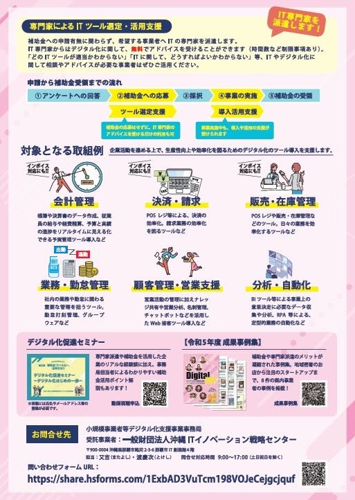 県内中小企業者及び小規模事業者等の労働生産性とIT活用の成熟度に関する調査を行い、その関係性を明らかにするとともに、調査結果をもとに補助対象事業者に対するITツール活用を助言し、ITツール導入を実施する事業に対して補助を実施する。