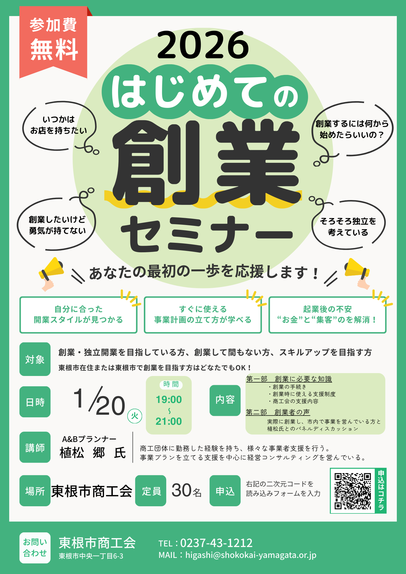 [東根市商工会] 「はじめての創業」セミナー開催のお知らせ