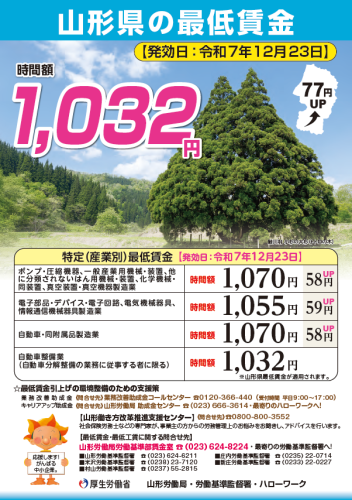 山形県最低賃金が改正されます。山形県最低賃金時間額1,032円(77円アップ)(効力発生日:令和7年12月23日)最低賃金制度は、年齢やパート・学生アルバイトなどの働き...