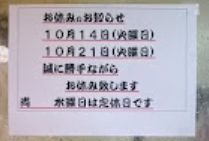 いつもご利用いただきありがとうございます。臨時休業のお知らせです。誠に勝手ながら10月14日(火)、10月21日(火)を臨時休業とさせていただきます。尚、水...