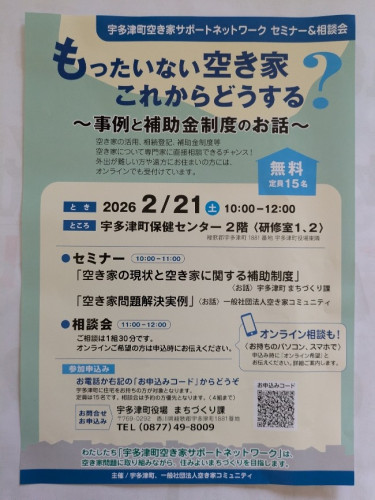 空き家サポ-トネットワ-クでは添付チラシのように2月21日(土)宇多津町保健センタ‐にて「もったいない空き家これからどうする~事例と補助金制度のお話~」というテ...