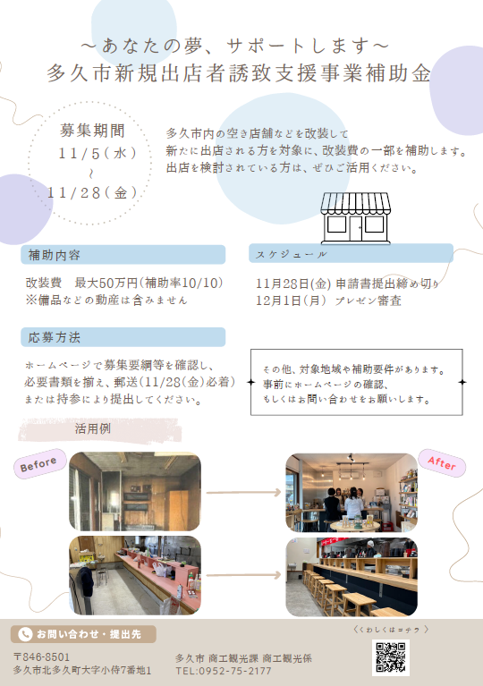 [多久市商工会] 多久市新規出店者誘致支援事業(補助金)の追加募集について