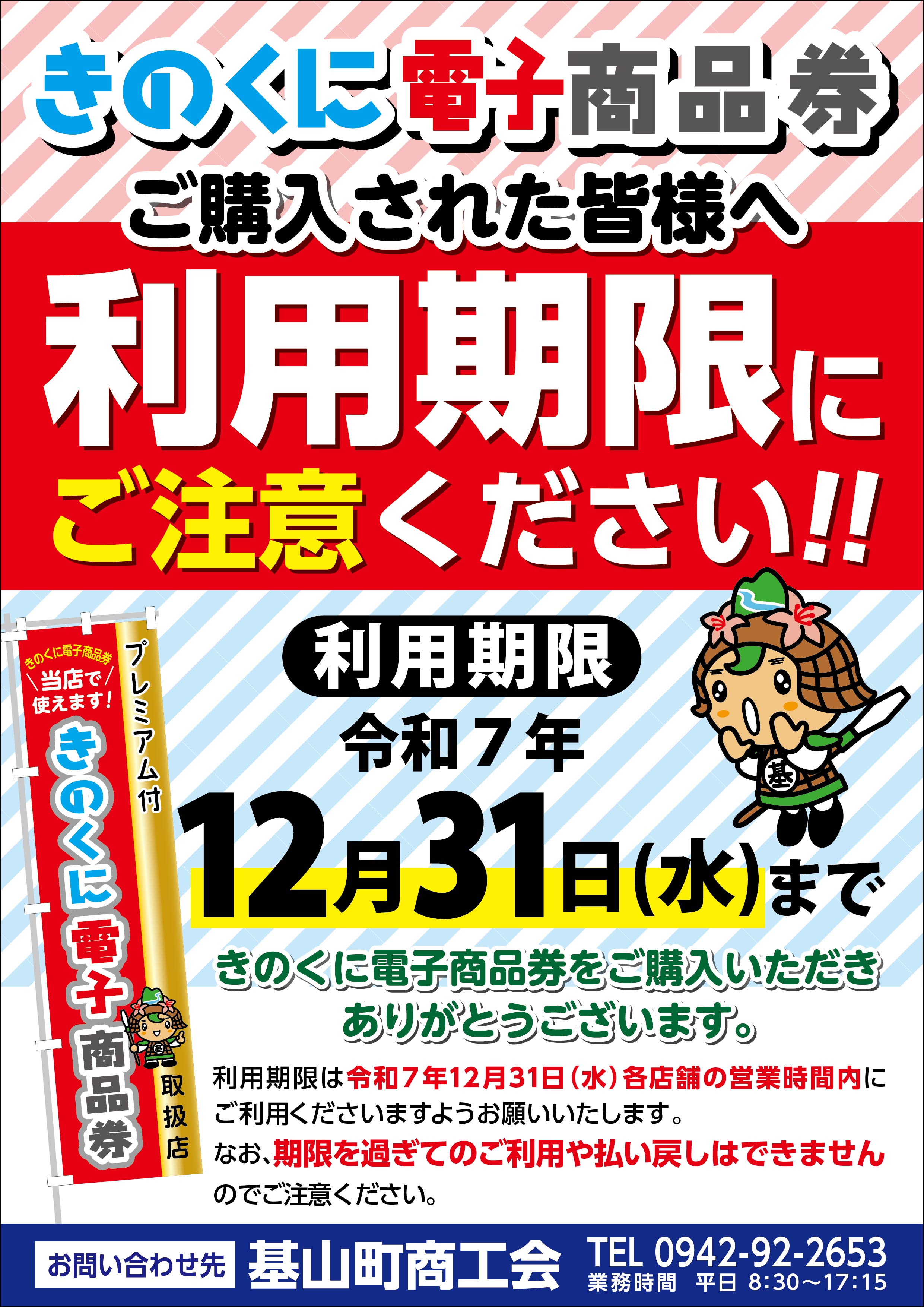 令和7年10月1日より販売しました「きのくに電子商品券」の使用期限は令和7年12月31日(水)までとなります。(取扱店が定める営業日・営業時間内に限ります)...