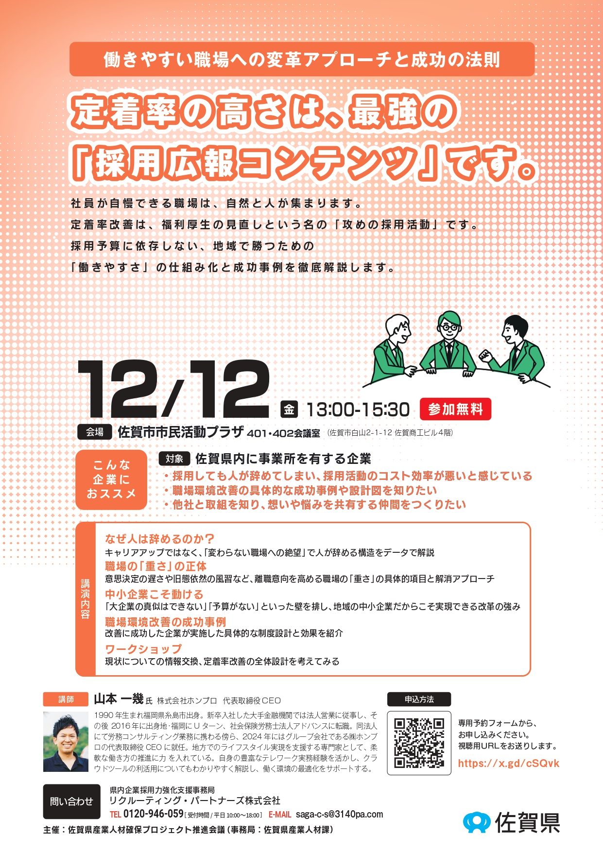 この度、佐賀労働局主催による従業員の定着支援セミナーが開催されます。是非ご参加ください! 【佐賀労働局主催】オンラインセミナー11月(求人票)12月(面接).pdf===...