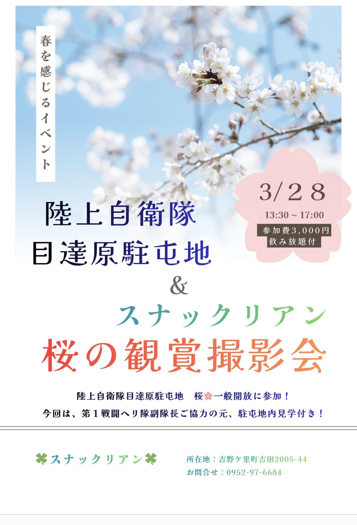 🌸リアン春イベントのお知らせ🌸3月28日…陸上自衛隊目達原駐屯地にて、桜🌸一般開放されます😊去年開催して好評だった☘️目達原駐屯地&リアン☘️の桜の鑑賞撮...