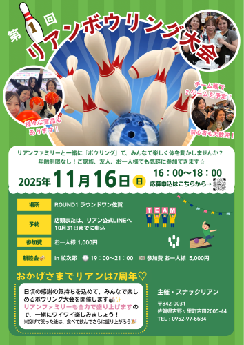 [🍀スナック リアン🍀] 🎳【第1回 リアンボウリング大会‼️】開催のお知らせ📢