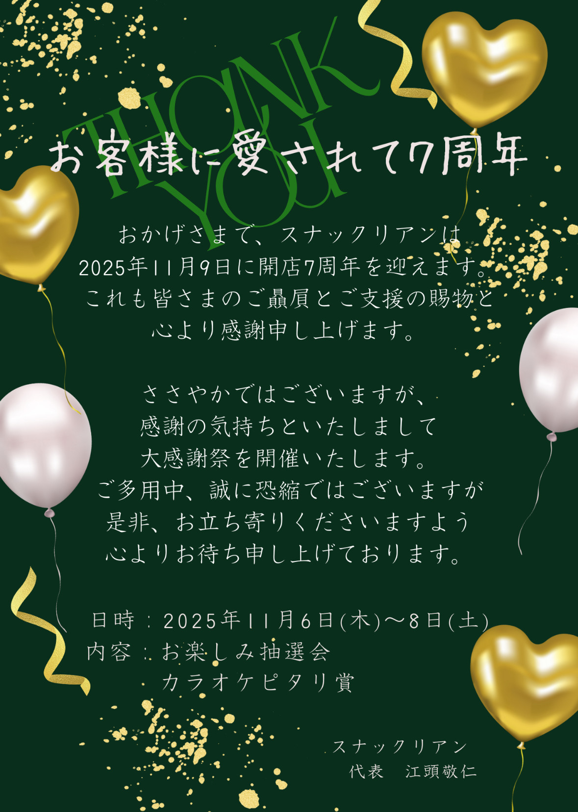 [🍀スナック リアン🍀] 🌼7周年大感謝祭🌼開催します😆