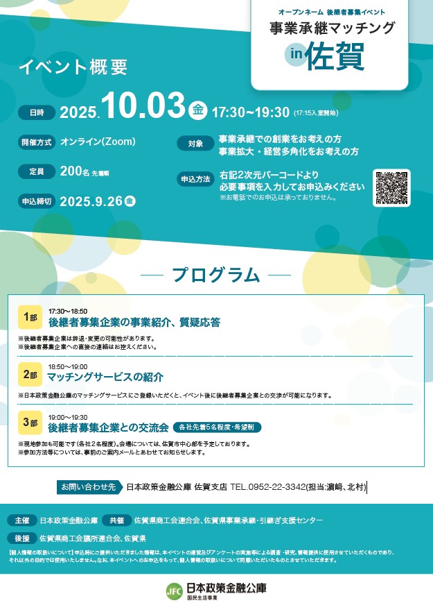 日本政策金融公庫佐賀支店では、オープンネームでの後継者募集イベントが