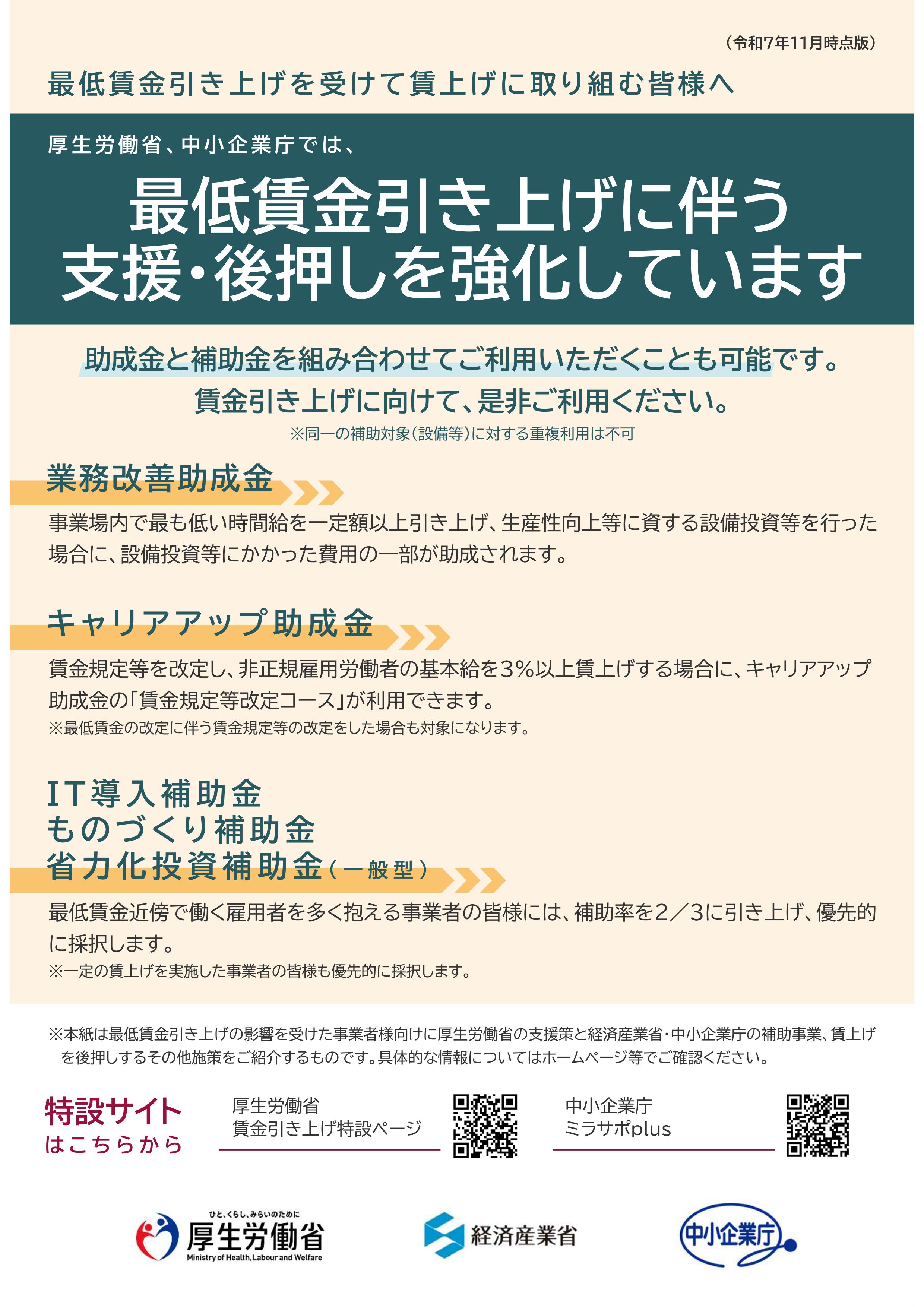 厚生労働省、中小企業庁では、最低賃金引き上げを受けて賃上げに取り組む事業者の皆様に向けて、 最低賃金引き上げに伴う支援・後押しを強化しています。