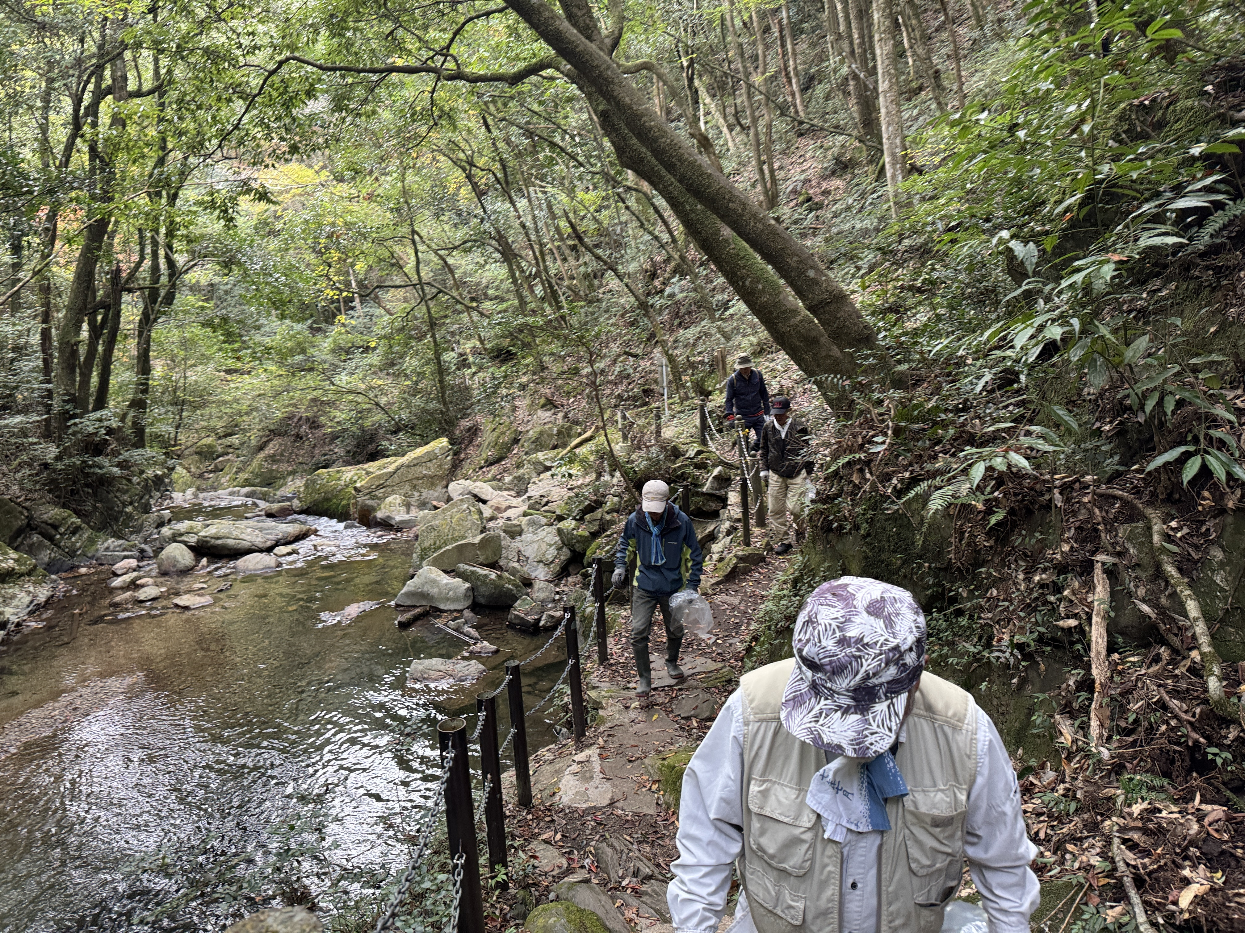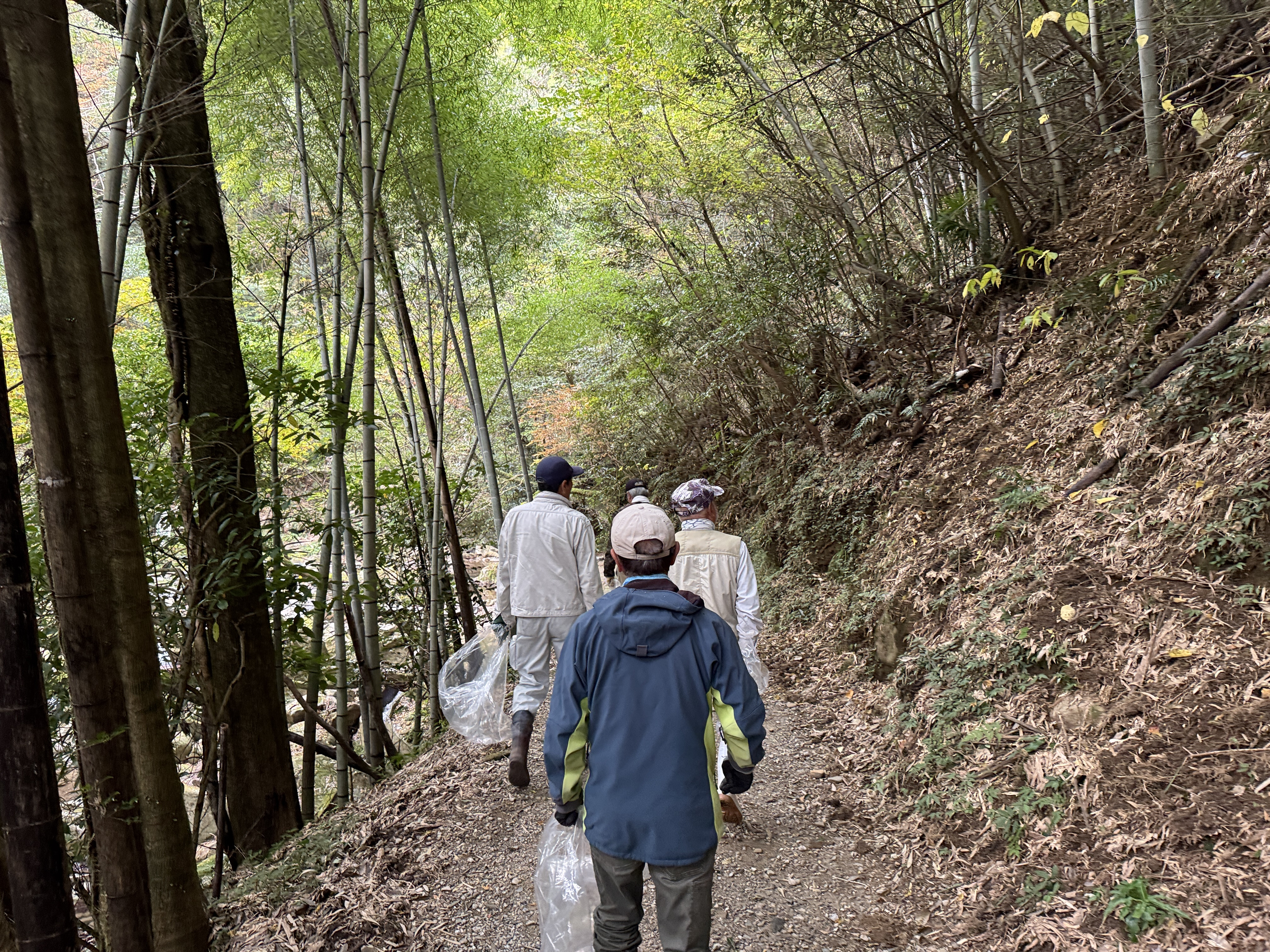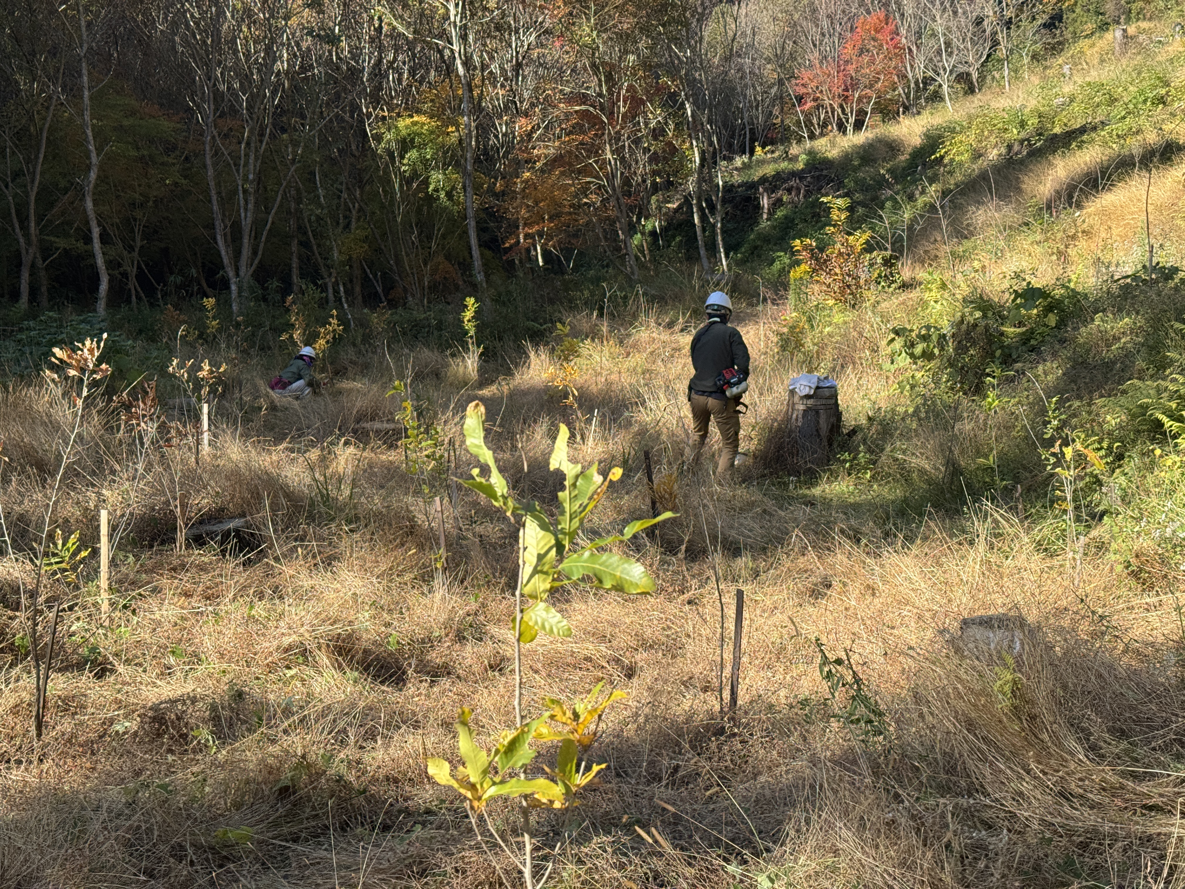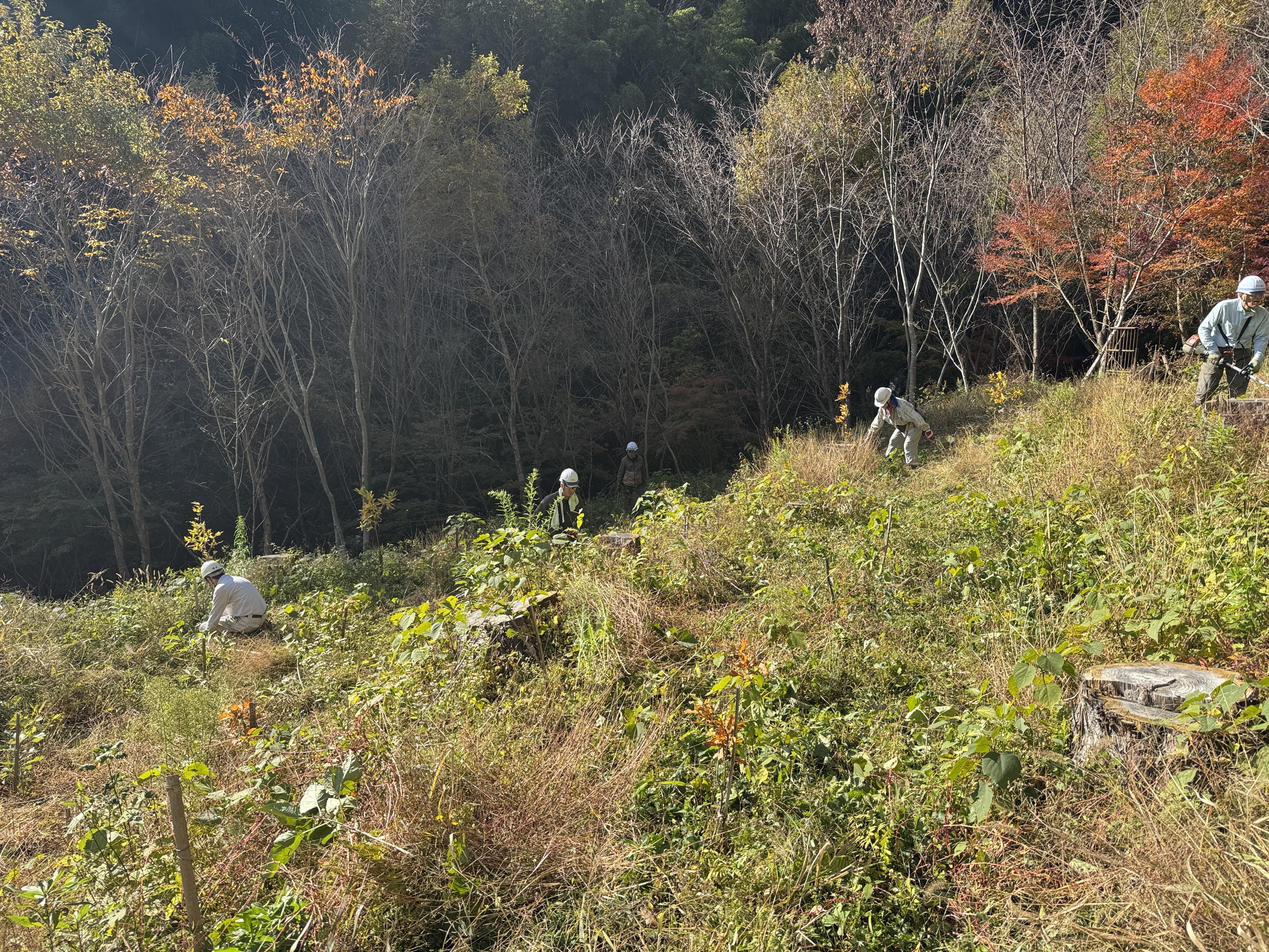 秋晴れ?のもと・・・水道局に集まったメンバー・・・バスに乗り向かうは田来原美しい森公園・・・老松生産森林組合長のご挨拶・・・体操に記念撮影と・・・徒歩で向かうは・・・うっそうと茂った急な坂・・・足元に注意しながら・・・手にノコを持って入り込む・・・雑木やツルをノコで切り取る・・・約2時間で陽射しも差し込む・・・気持ちが良い・・・昼食交流会にはいつもの鳥串や豚汁・・・机の上には紅葉したもみじの枝・・・その後、来年度計画の大山農業体験交流会についてのお話・・・竹細工の講習も・・・帰りは木の花ガルテンで買い物・・・いいちこの紅葉祭でも楽しんで・・・無事に水道局に到着・・・お疲れ様でした