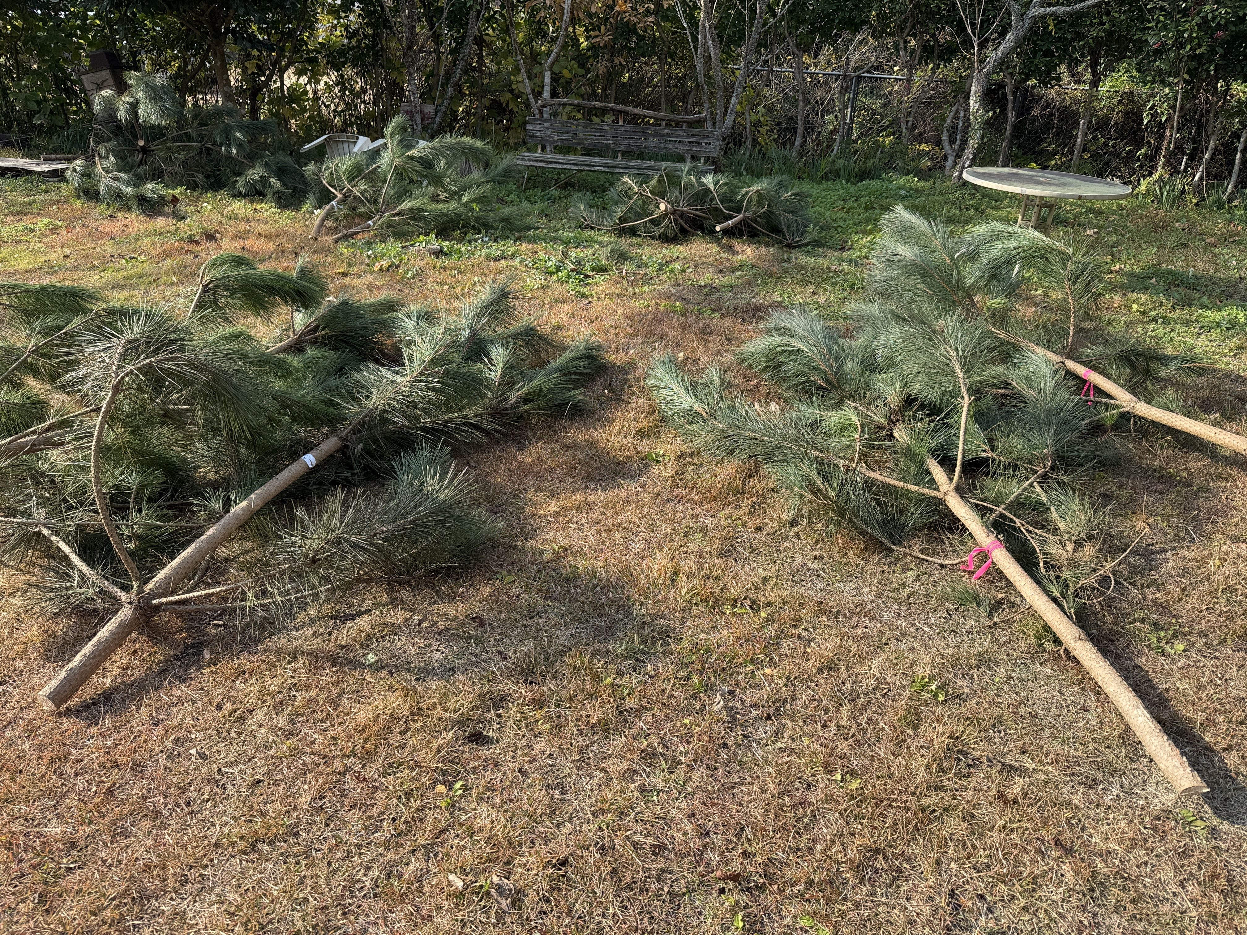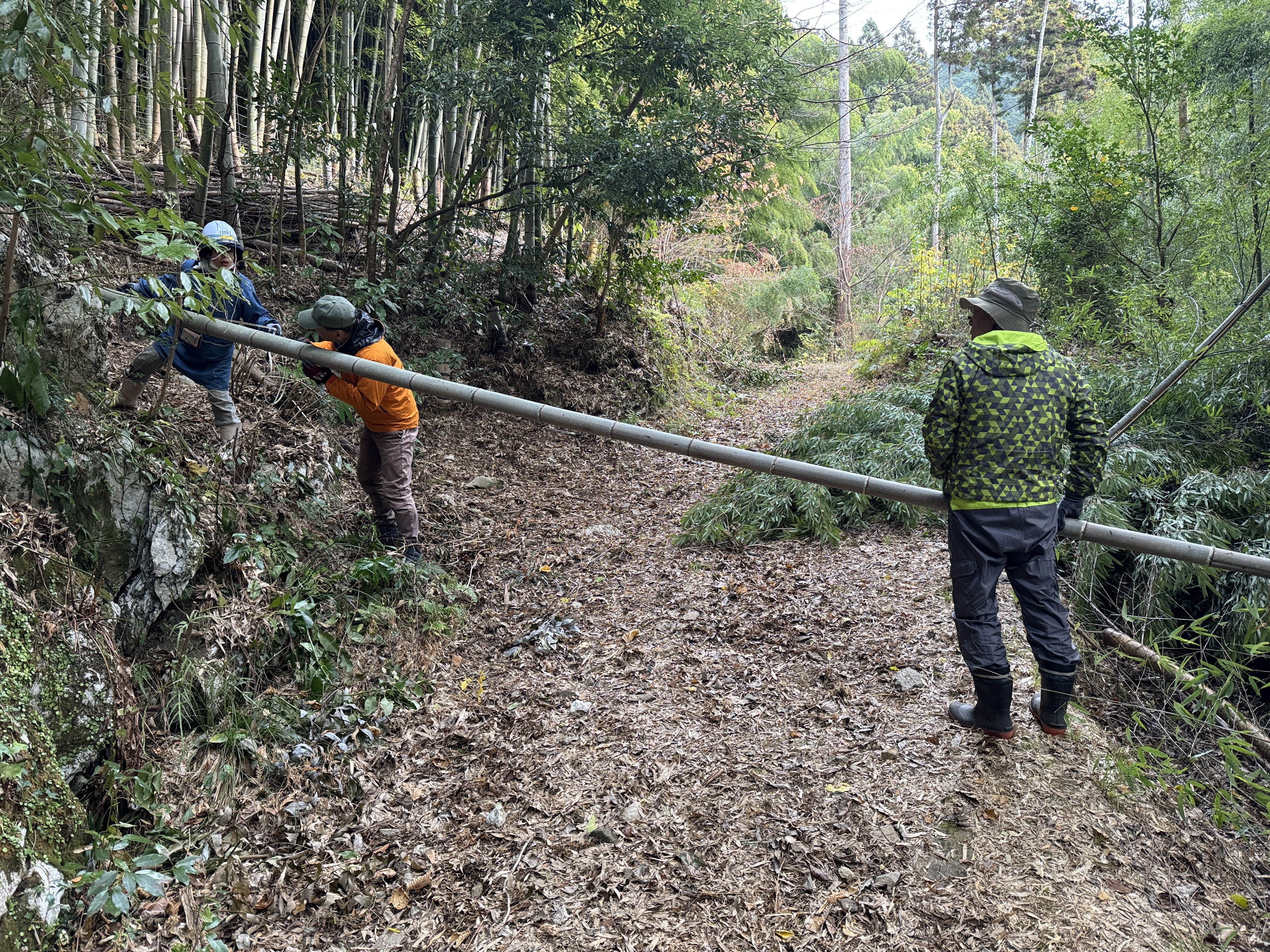 小雨の降る中・・・茶話の森に集合したメンバー・・・天気模様を気にしながら・・・曲渕ダムの流れ込みの場所に移動・・・目当ての太い竹を探す・・・竹の根元を切って引き出す・・・なかなか手ごわい・・・ロープを掛けて数人で・・・やっと出てきた立派な竹・・・4メートル程度に切り分ける・・・軽トラの荷台に一杯に・・・一度では運べず・・・二回に分けて・・・竹の切り出しは終了・・・次は松・・・ボランティアの森の先から・・・立派な松を切り出す・・・松くい虫にやられている松も目立つ・・・今年の松は確保できたが・・・来年度以降は難しいか・・・明日からはいよいよ福岡市役所と福岡市水道局をはじめ・・・4か所の門松製作に取り掛かる