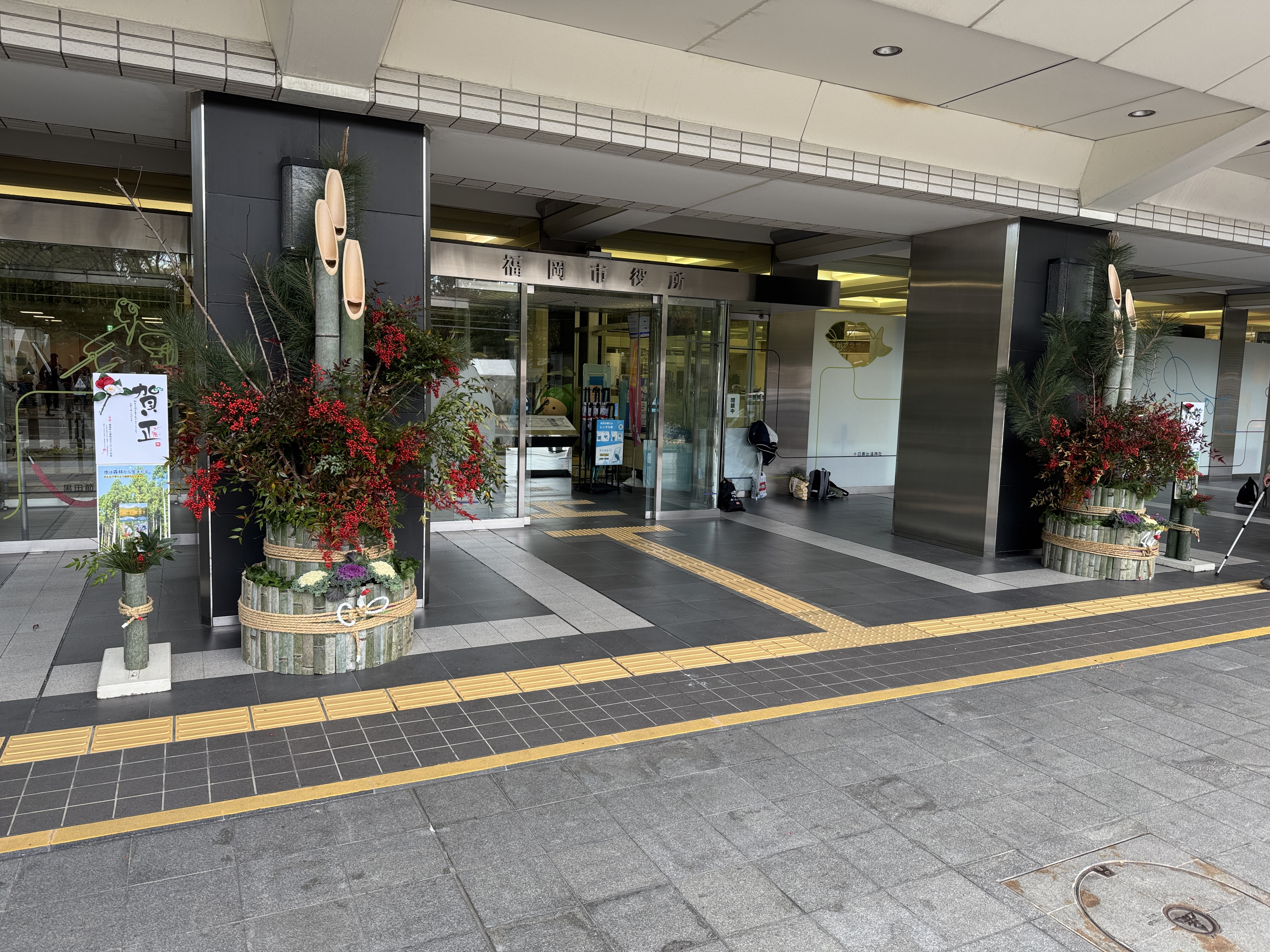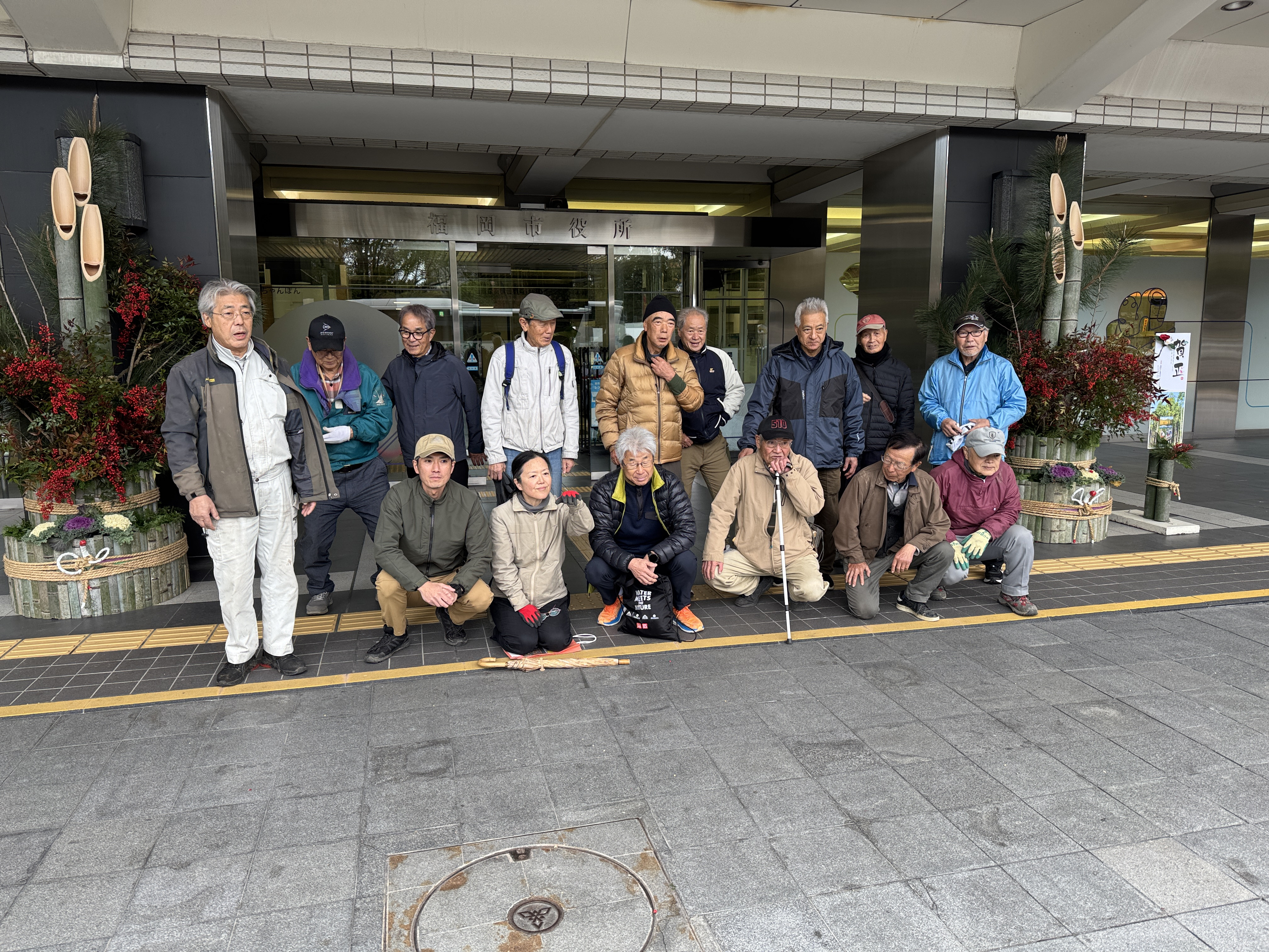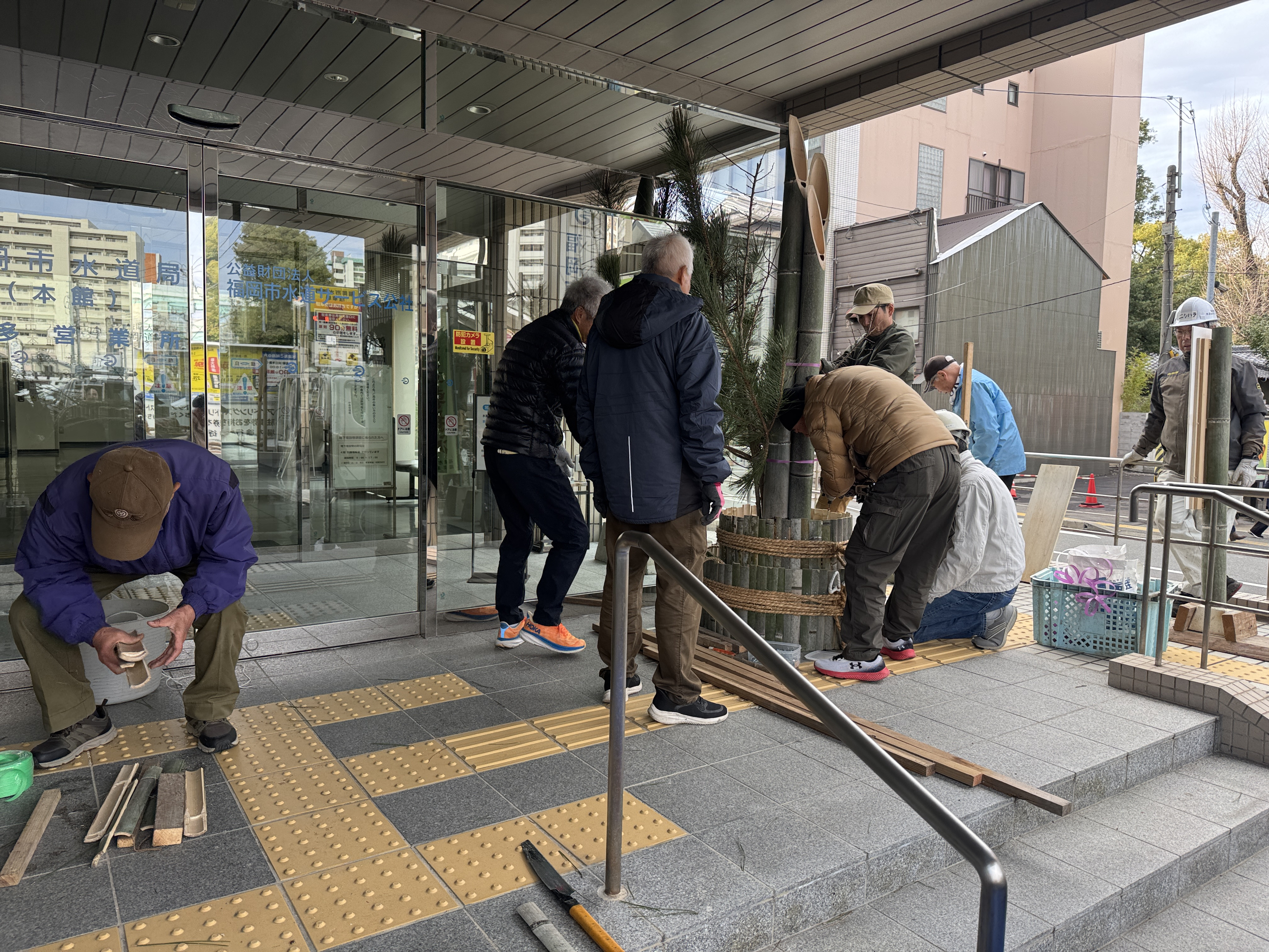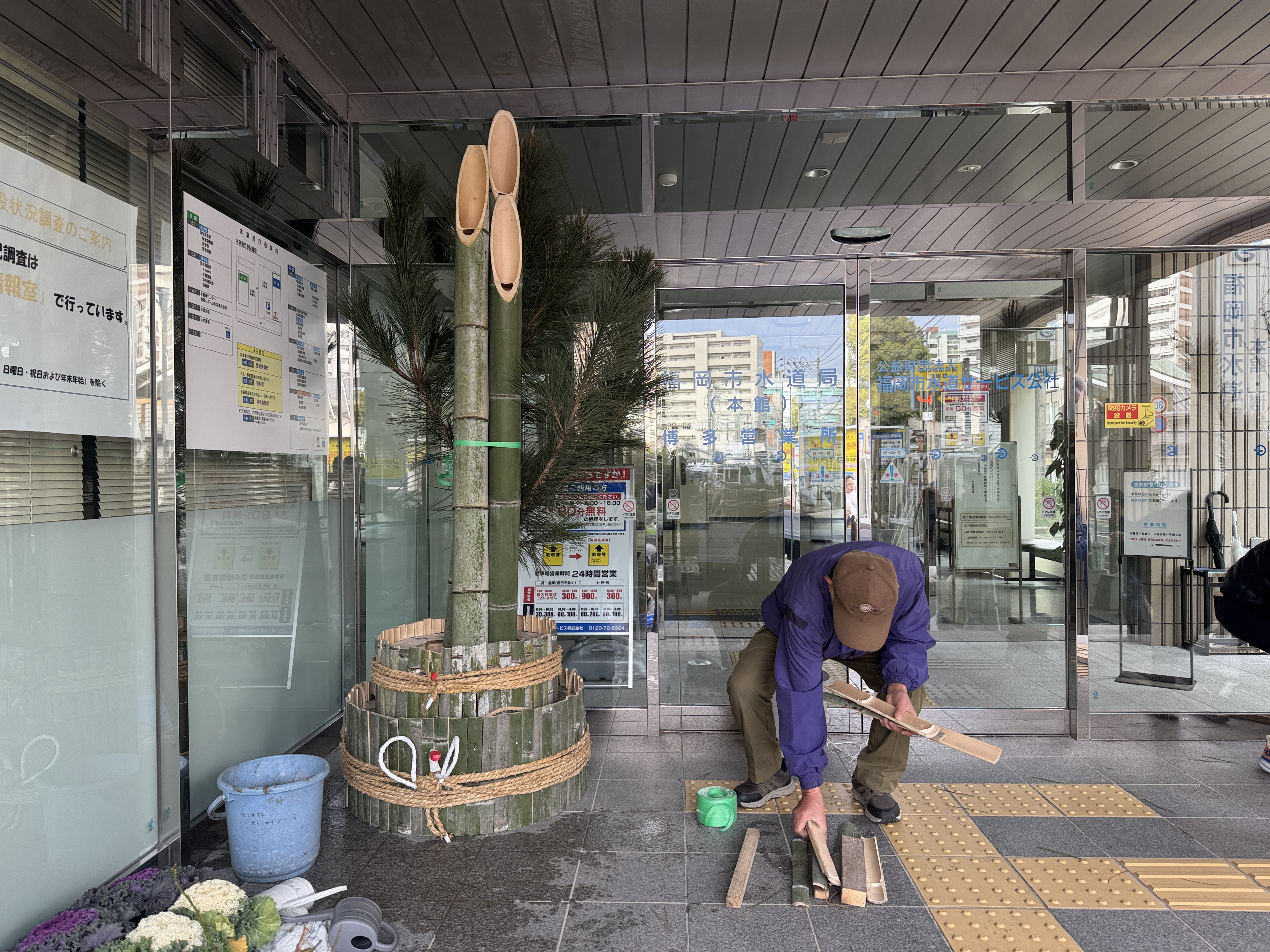 好天に恵まれて・・・門松製作が進みます・・・先ずは福岡市役所と福岡市水道局の門松台座に・・・割った竹を張り付ける・・・ゴムロープで抑えつつ・・・ドリルで穴を明け・・・くぎを打ち込む・・・数は1台座につき200本・・・台座が4台なので800本・・・番線で締め上げて・・・荒縄を巻く・・・上から3・5・7本ずつ・・・縁起が良い数字・・・これで台座が完成・・・次は門松の高さの確認・・・門松と松の高さを調整・・・次は台座の中に入れるバケットに水漏れがないか確認・・・次は梅と南天の仕分け・・・なかなか大変・・・すべて終了し・・・皆様が良い年を迎えられますように、日曜日には福岡市役所正門と福岡市水道局正門に設置します