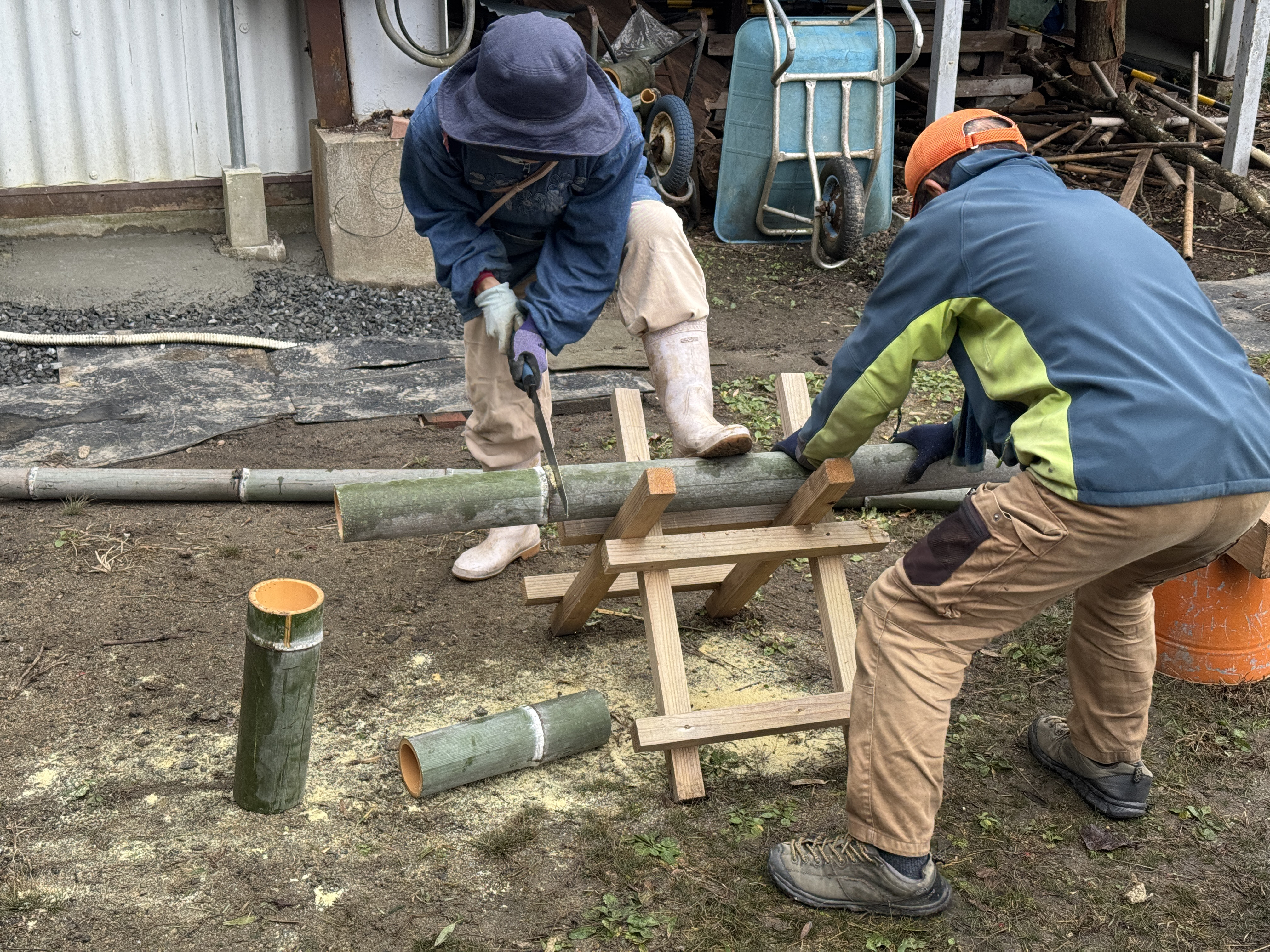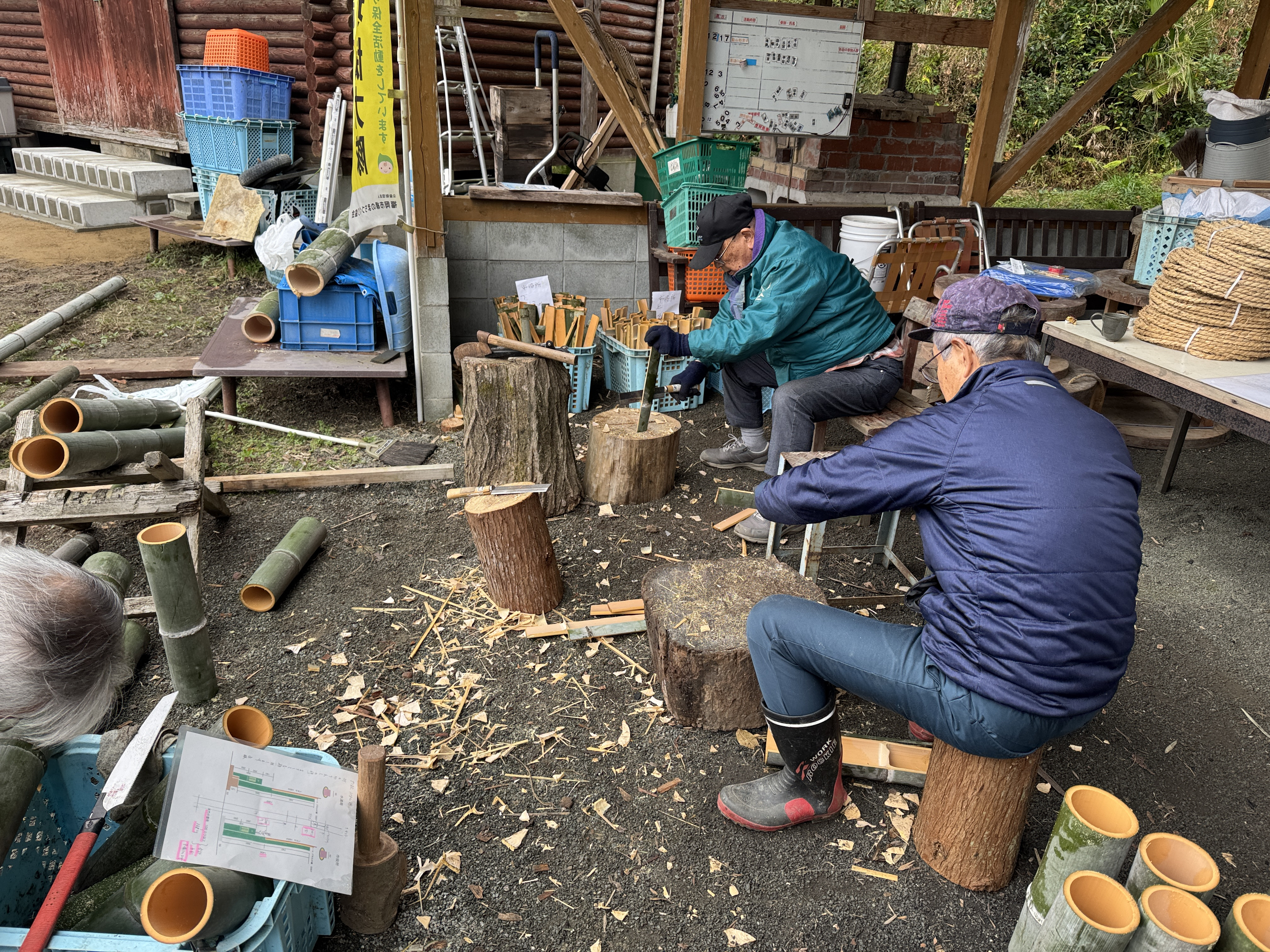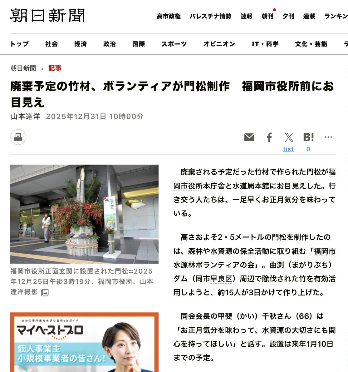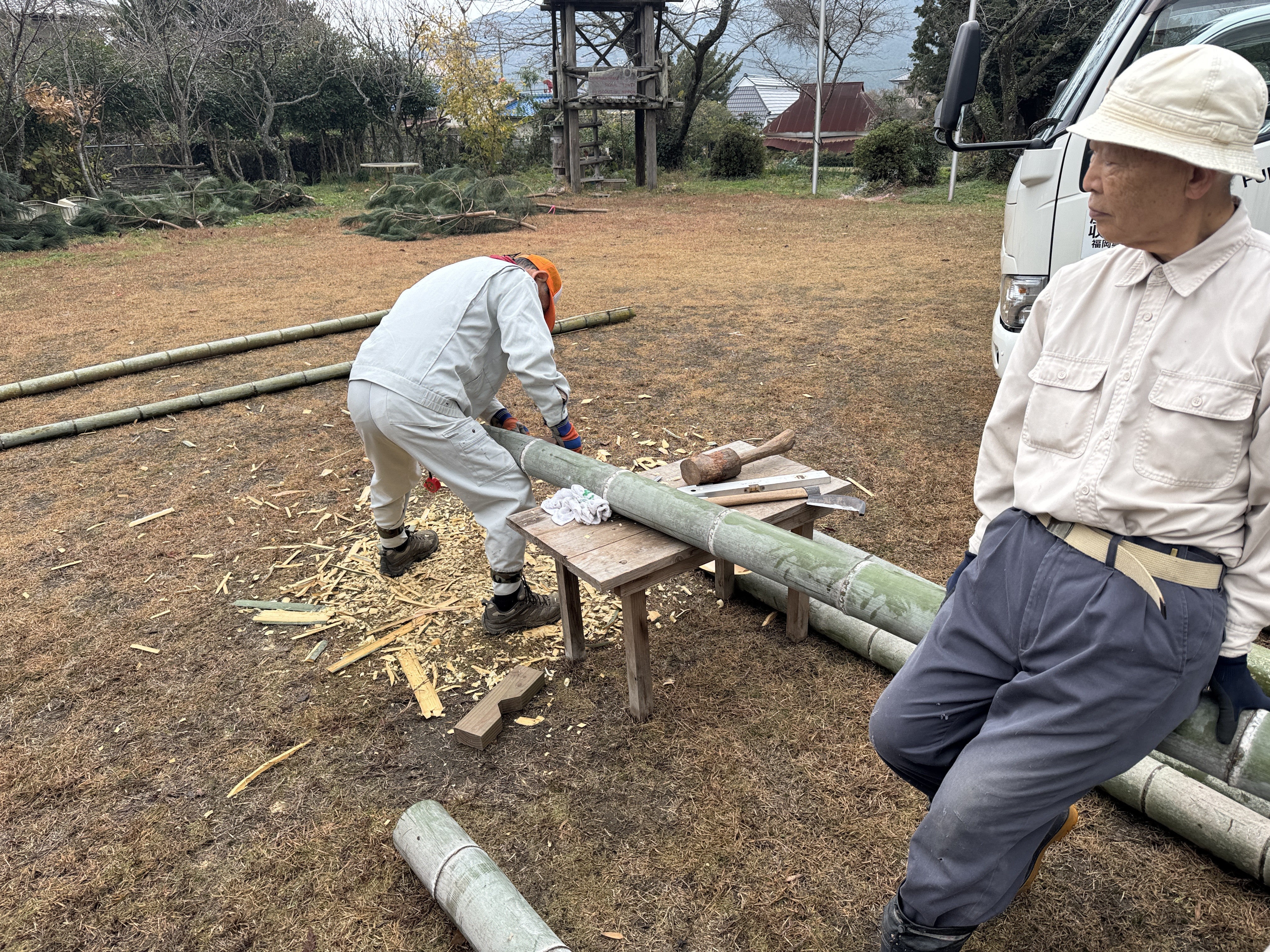 好天に恵まれて・・・門松製作が進みます・・・先ずは福岡市役所と福岡市水道局の門松台座に・・・割った竹を張り付ける・・・ゴムロープで抑えつつ・・・ドリルで穴を明け・・・くぎを打ち込む・・・数は1台座につき200本・・・台座が4台なので800本・・・番線で締め上げて・・・荒縄を巻く・・・上から3・5・7本ずつ・・・縁起が良い数字・・・これで台座が完成・・・次は門松の高さの確認・・・門松と松の高さを調整・・・次は台座の中に入れるバケットに水漏れがないか確認・・・次は梅と南天の仕分け・・・なかなか大変・・・すべて終了し・・・皆様が良い年を迎えられますように、日曜日には福岡市役所正門と福岡市水道局正門に設置します