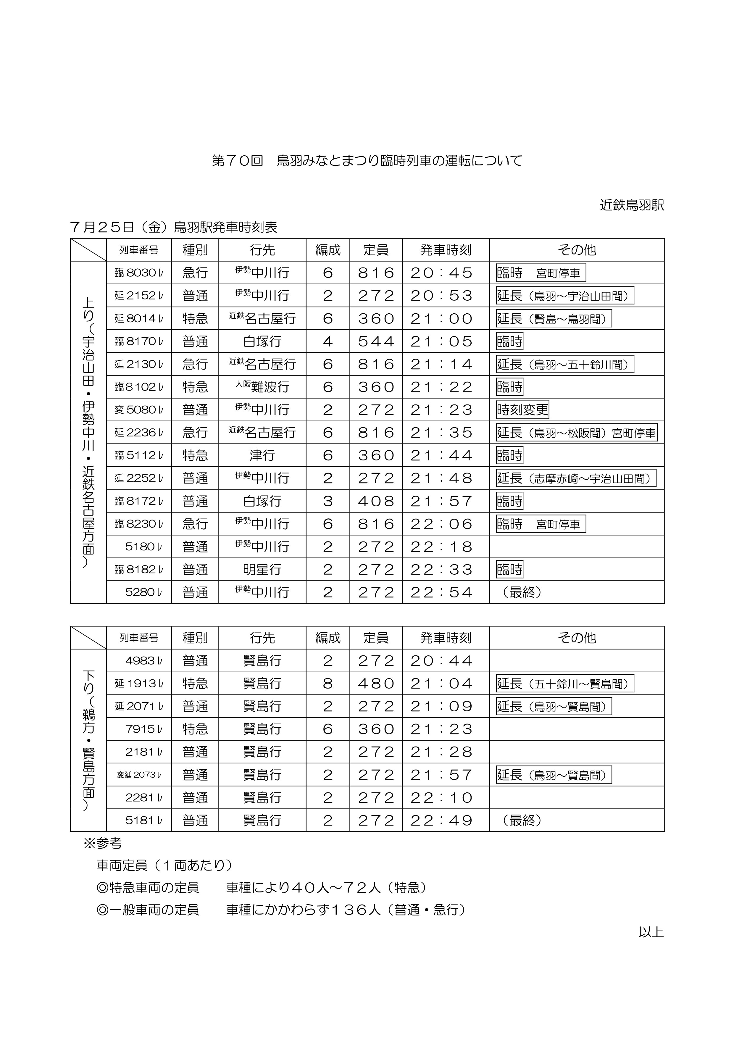 近鉄鳥羽駅臨時列車 時刻表 7月25日当日分