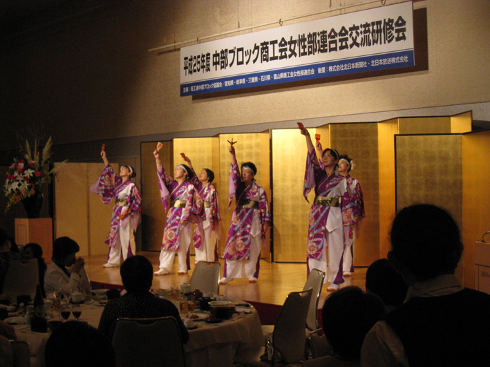 交流会では、富山の地元食材を使った料理が振舞われ、麦屋踊り、よさこい、新舞踊のアトラクションで参加者をもてなしました。