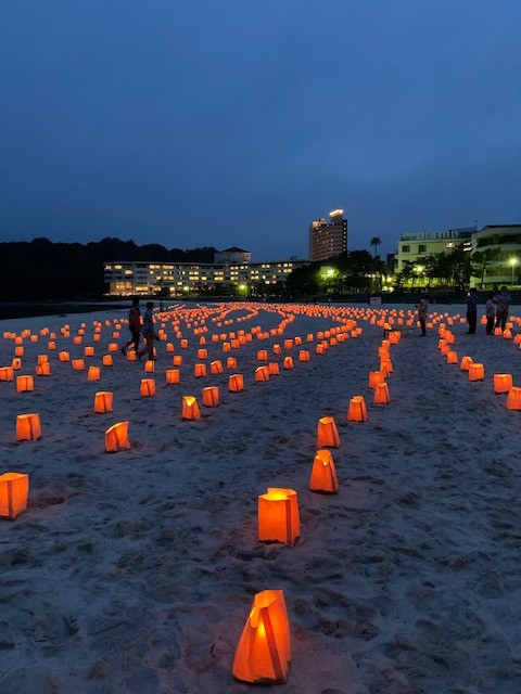 白良浜で沢山の方のお願いをランタンと共に夜空にあげるお手伝いをしました。