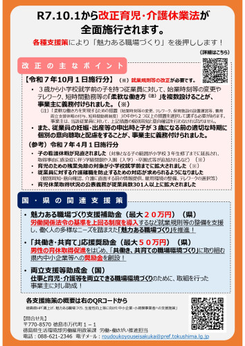 徳島県 労働雇用政策課より徳島県 経済産業政策課を通じて「改正育児・介護休業法の全面施行と各種支援策」について周知依頼がありましたので、下記のとおりおしらせ...