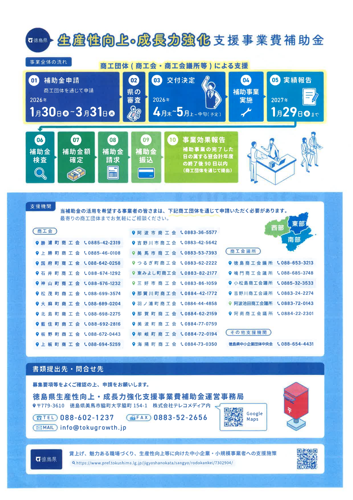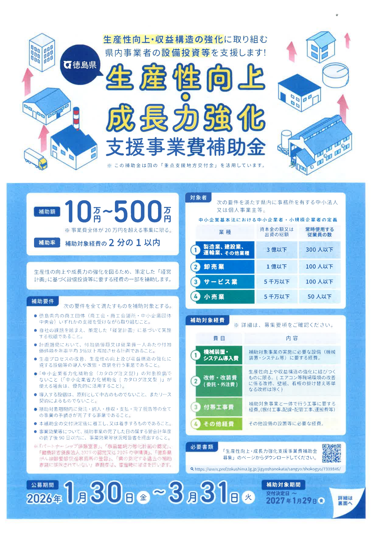 徳島県内における企業・個人事業主の皆様の生産性の向上や成長力の強化を図るため、策定した「経営計画」に基づく設備投資等に要する経費の一部を補助する「生産性向上・成長力強化支援事業費補助金」の募集が、以下の期間より開始されます。