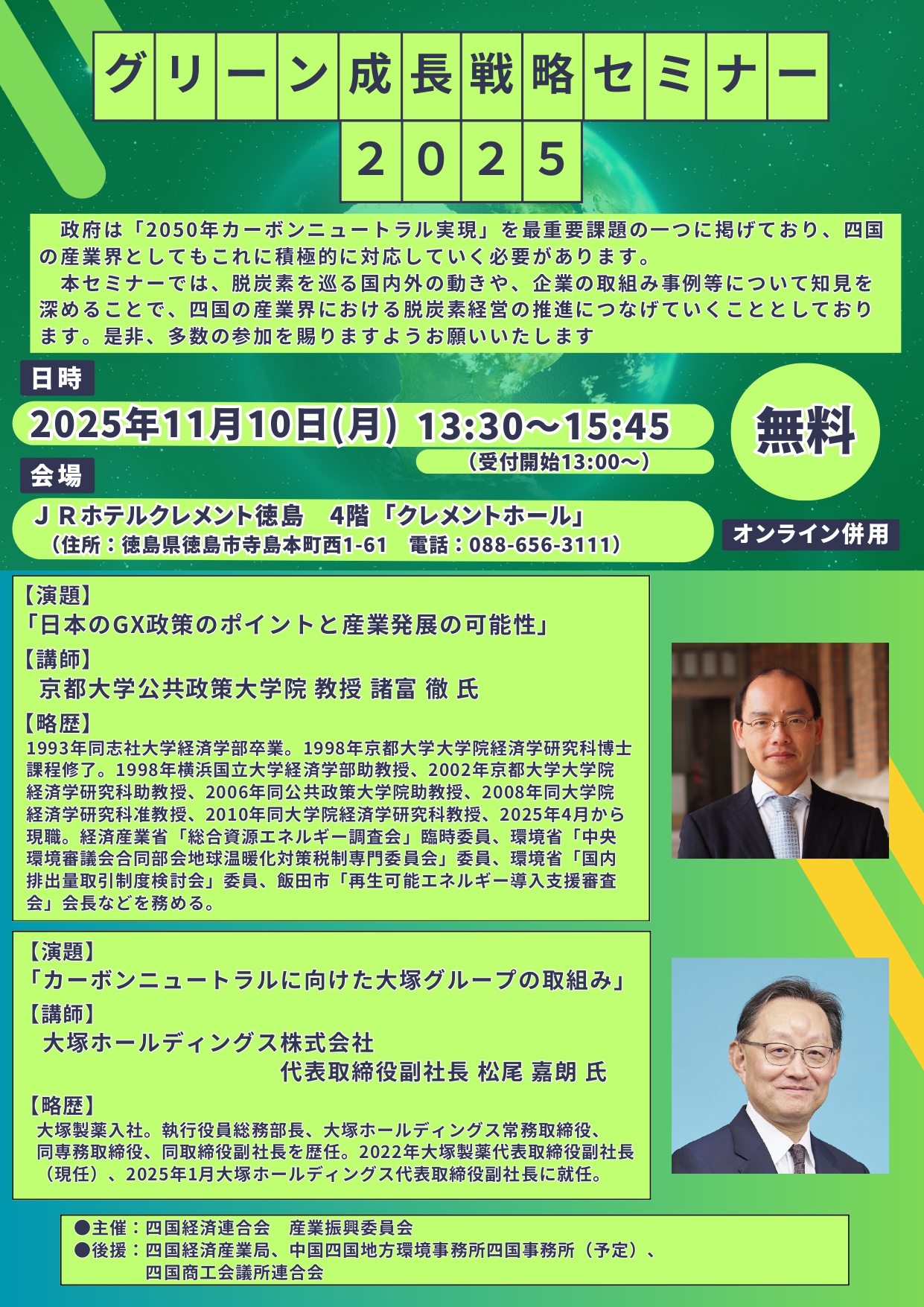 本セミナーでは、脱炭素を巡る国内外の動きや、企業の取組み事例等について知見を深めることで、四国の産業界における脱炭素経営の推進につなげていくことを目的としています 。ぜひ、この機会に多数ご参加ください 。