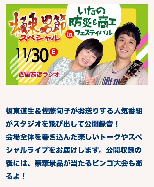 パワーステージ🎤ダンス・音楽LIVE・クッキングショー・JRT四国放送ラジオ公開録音「板東男節」・本数当てクイズ(たまご?ドレッシング?)ビンゴ大会・働く車・災害支援バイク隊・キッチンカー・福投げもあるよ。。板野町を1日満喫してくださいね。