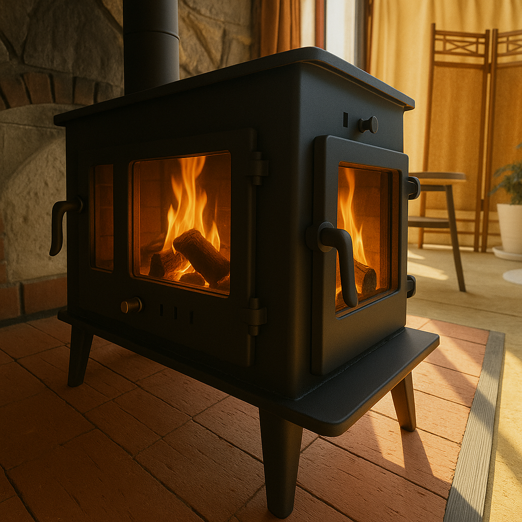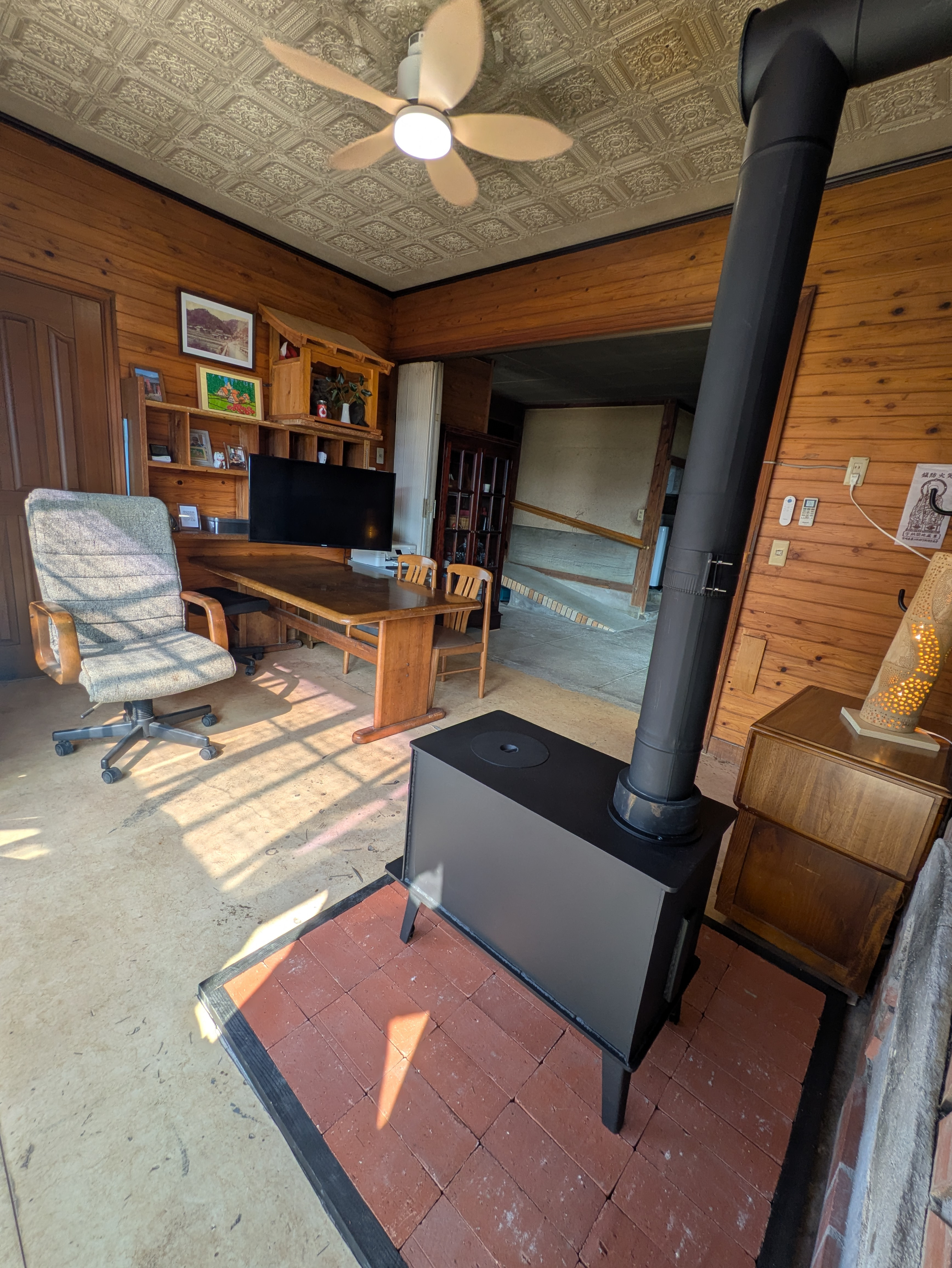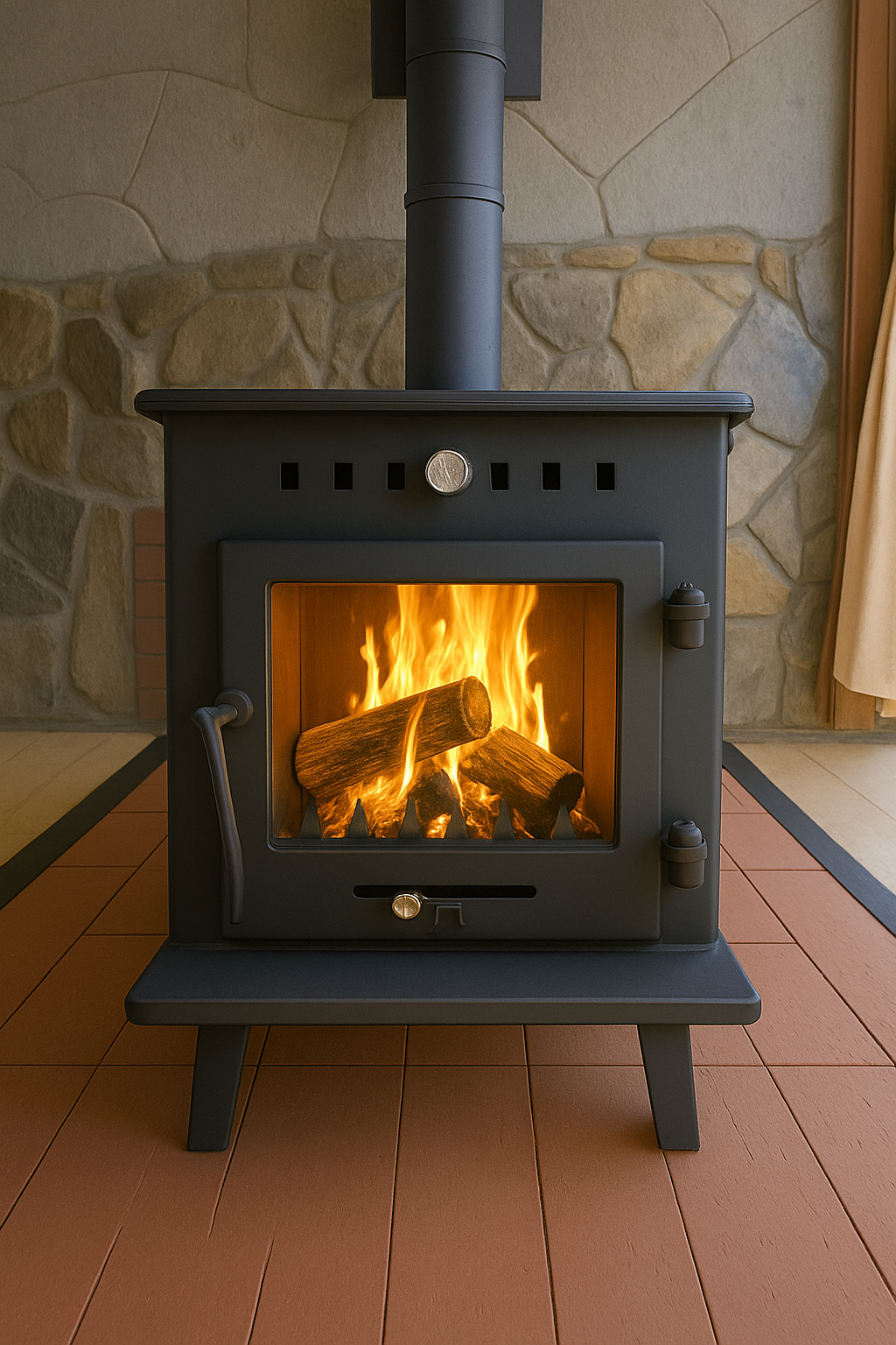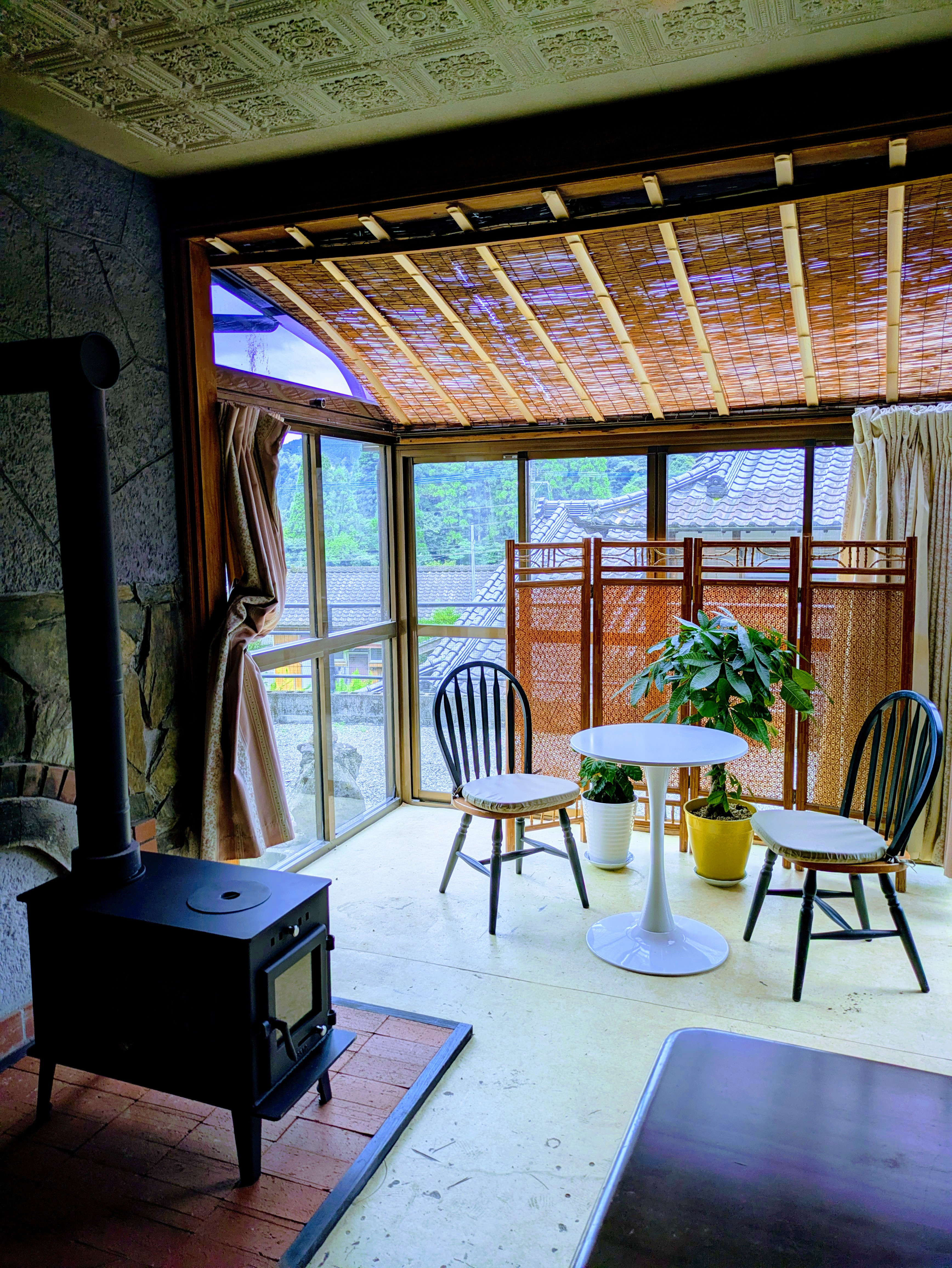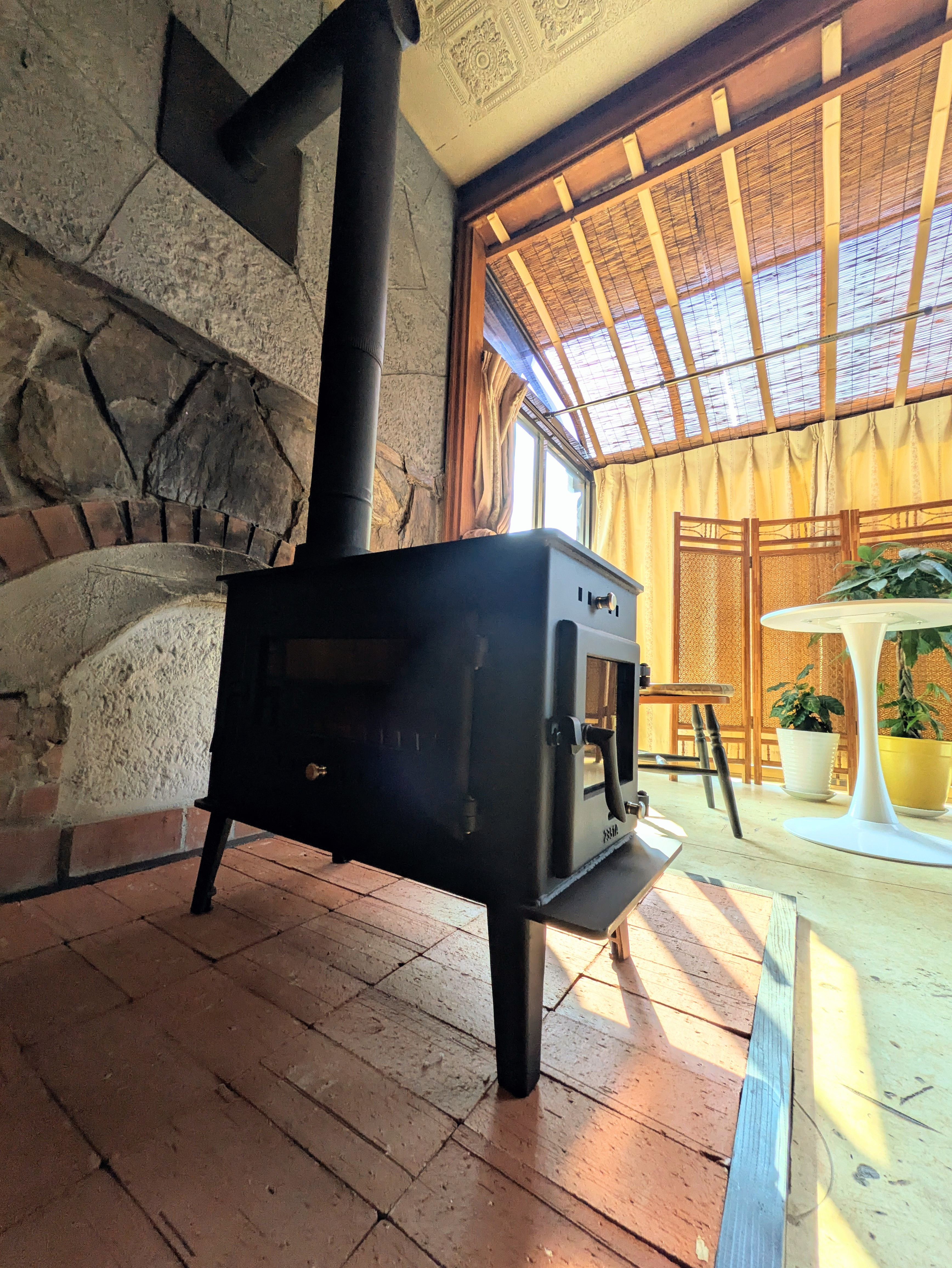 サンルームには鉄製の薪ストーブを設置しています。 冬は薪がじんわりと放つ柔らかなぬくもりに包まれてください。心までほっと温まります。