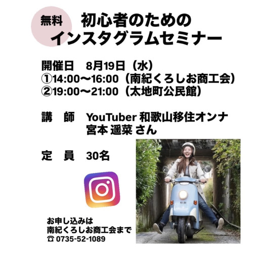 初心者のためのインスタグラムセミナーを開催します!開催日 8月19日(火) ①14:00~16:00 南紀くろしお商工会 ②19:00~21:00 太地町公民館定...