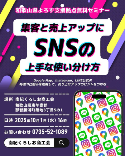 和歌山県よろず支援拠点による、SNSの上手な使い分け方を学ぶセミナーが開催されます。GoogleMap、Instagram、公式LINEの特徴や仕組みを理解して、集客と売上アップのヒ...