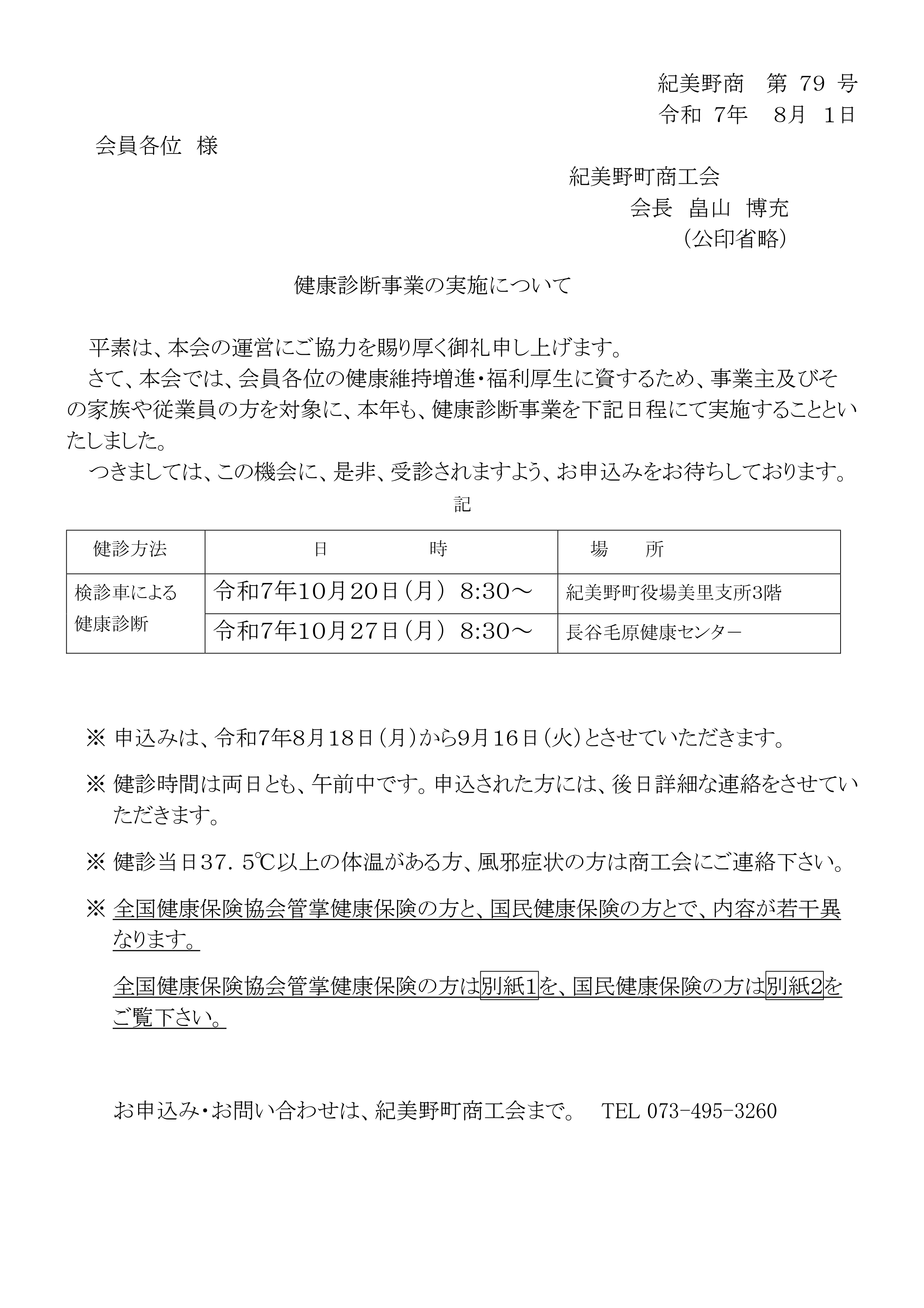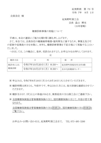 [紀美野町商工会] 令和7年度 健康診断事業の実施について