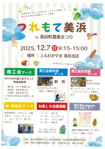 令和7年12月7日(日)JAわかやま美浜支店周辺にて美浜町農業まつりが開催されます。当商工会も『つれもて美浜in美浜町農業まつり』を開催MIHAMAサミット産品物販や...