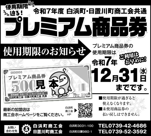[日置川町商工会] 令和7年度「白浜町・日置川町商工会共通プレミアム商品券」の使用期限が迫っています(12月31日まで)