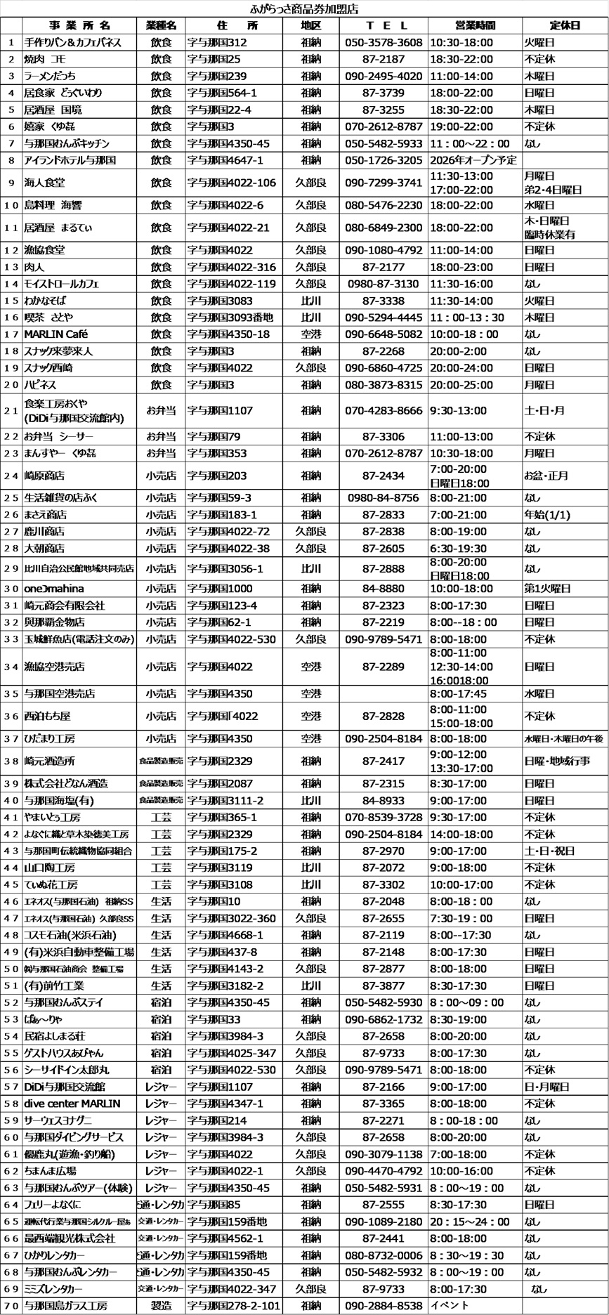 〇ふがらっさ商品券加盟店 更新2025.11.6