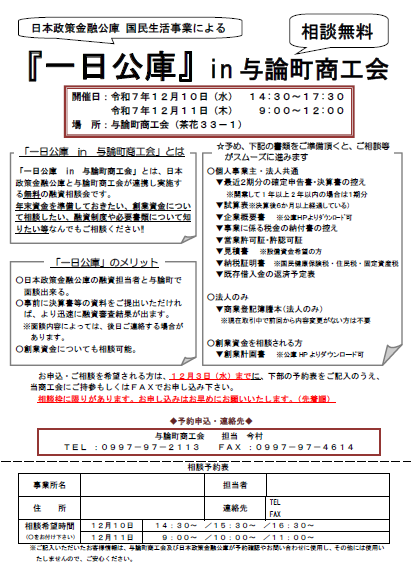 与論町商工会では日本政策金融公庫と連携し事業者が与論島で直接相談が出来る「一日公庫 in 与論町商工会」を開催いたします。