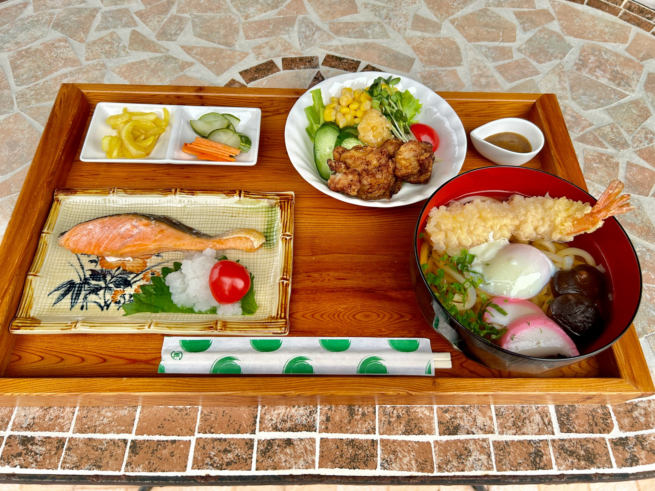 (天ぷらうどんorそば・焼き鮭・唐揚げ)900円