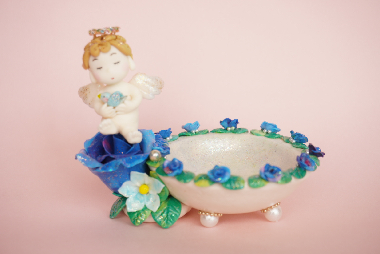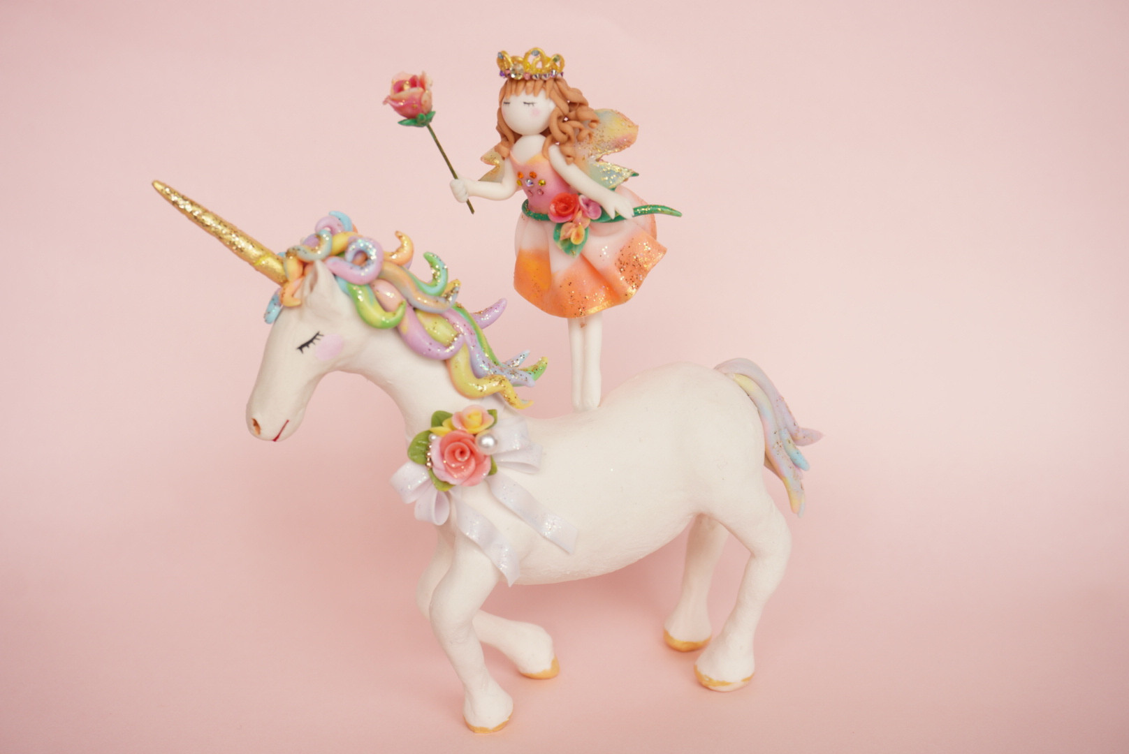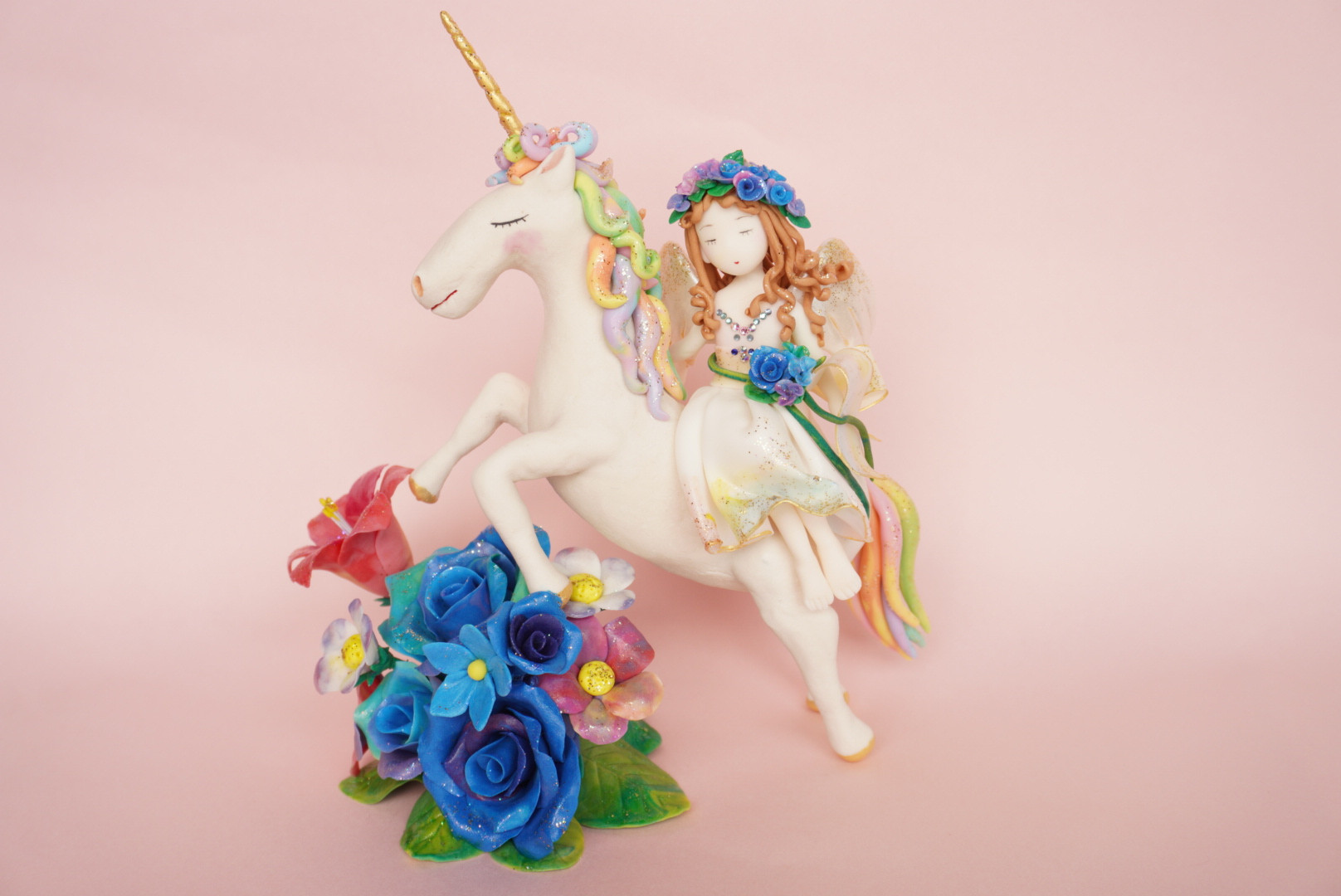 神様と仏様の人形は、陶芸粘土で制作。ペガサスやお姫さまのメルヘンドールと小物たちは、樹脂粘土とオリジナル粘土で制作しています。